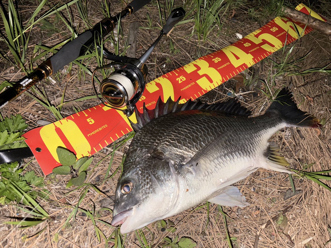 今回はフリーリグでチヌを狙って参りました!釣りを始めたタイミングでは上げ始めで潮位が低く魚が入っているか不安を残しスタート、小さいあたりはあるものの中々ハリをかけれず気がつくと1時間半が経過…、ランガンしながら試すも釣果には繋がらず。潮位徐々に上がり最後に実績のあるポイントで再チャレンジ、すると大きく引ったくられるようなあたりに鬼フッキングしナイスサイズ45センチのキビレをゲット!最後の最後に良型の魚に出会えて満足な釣行となりました!