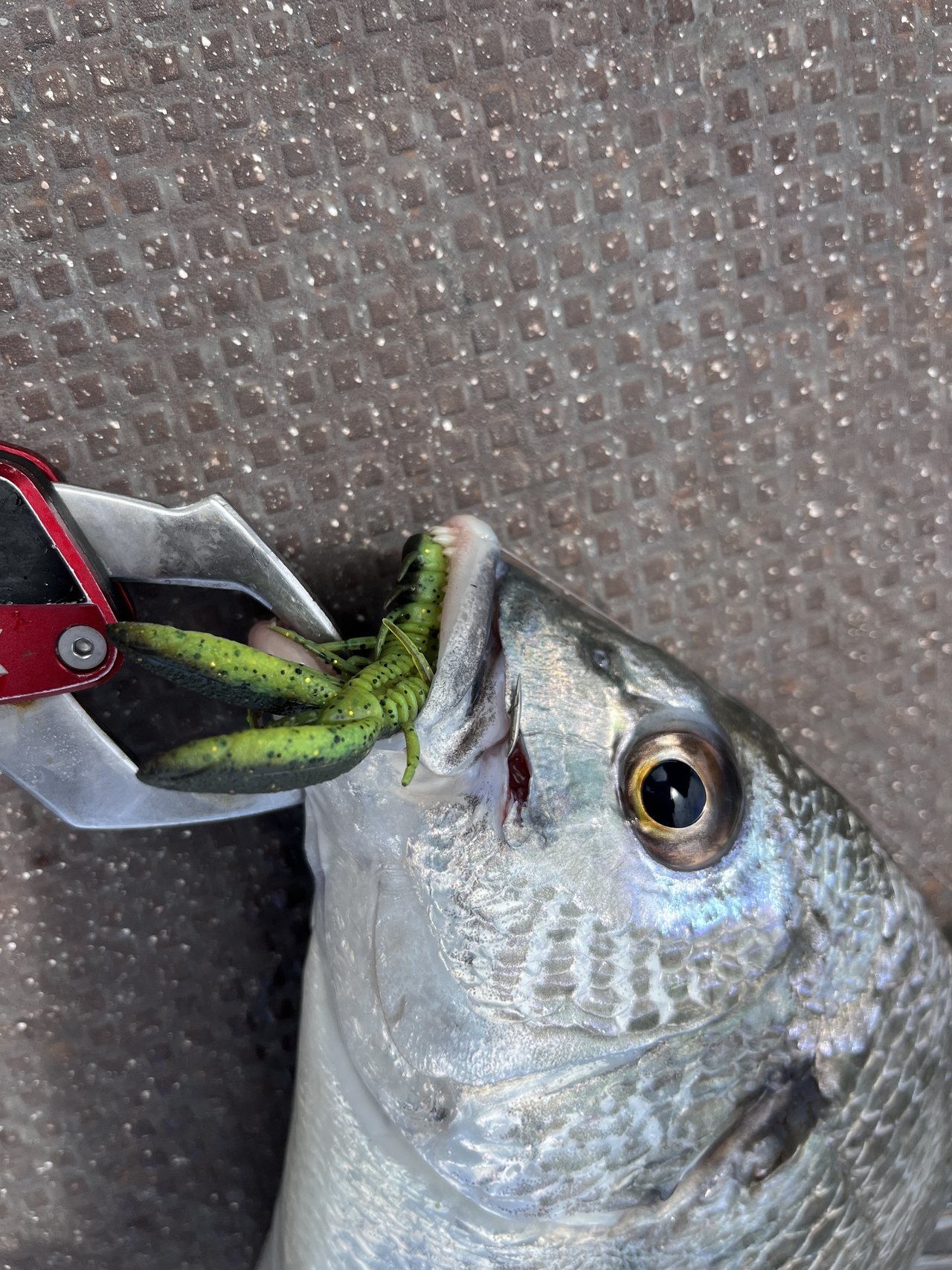 チヌトップが開幕したと言うことで、木更津のオルカさんに行ってきました。まずは、神カラーのエアラコブラ60ライムスタークリアーを投げて、様子をみてみる。水質はクリアでルアーカラーもクリア系が良いとの事。すると3投目にヒット!幸先の良いスタート。ジュボッと音と共にルアーが消えるのは視覚的にも楽しい釣り。よくあるビックリ合わせは厳禁なので注意。船長の的確なポイント移動のおかげでコンスタントに釣果を伸ばして、トップ12枚、自分は8枚でした。8枚のうちライムスタークリアで6枚でした。神カラーと呼ばれるわけですね。これからが本格的なシーズンですので、ぜひ挑戦してみてください。