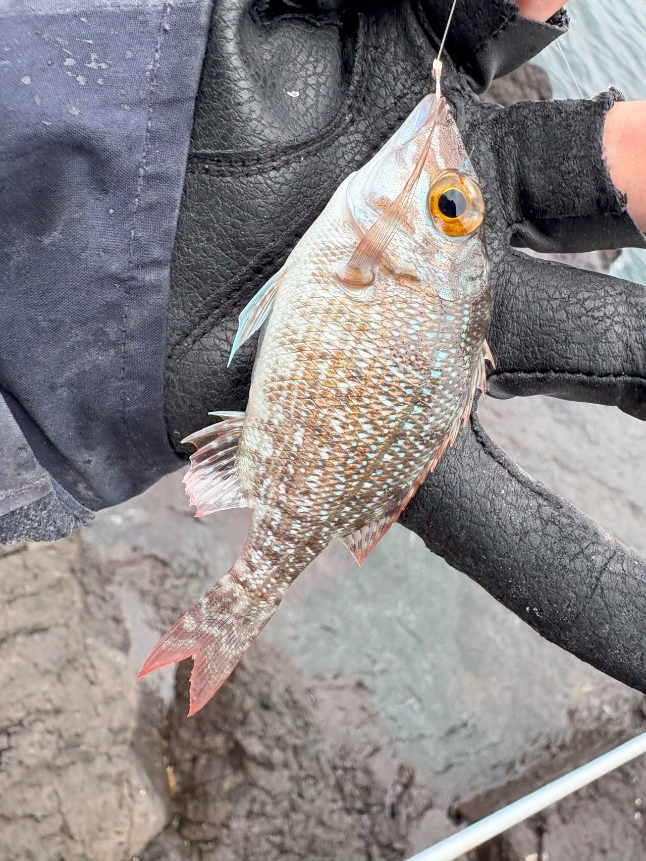 心も折れかけ、休憩がてらパンを食べながら、他の方の釣り方を観察。それをヒントに再開後、3度目のアタリをキャッチし、今度はしっかりキャッチでき、クロダイを釣り上げる事が出来ました。