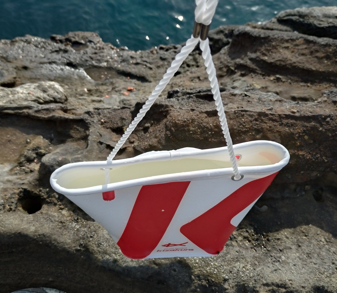 キザクラの水汲みバケツは海水を汲んだ後、持ち上げる際に水がこぼれにくい仕組みになっており、おすすめです。