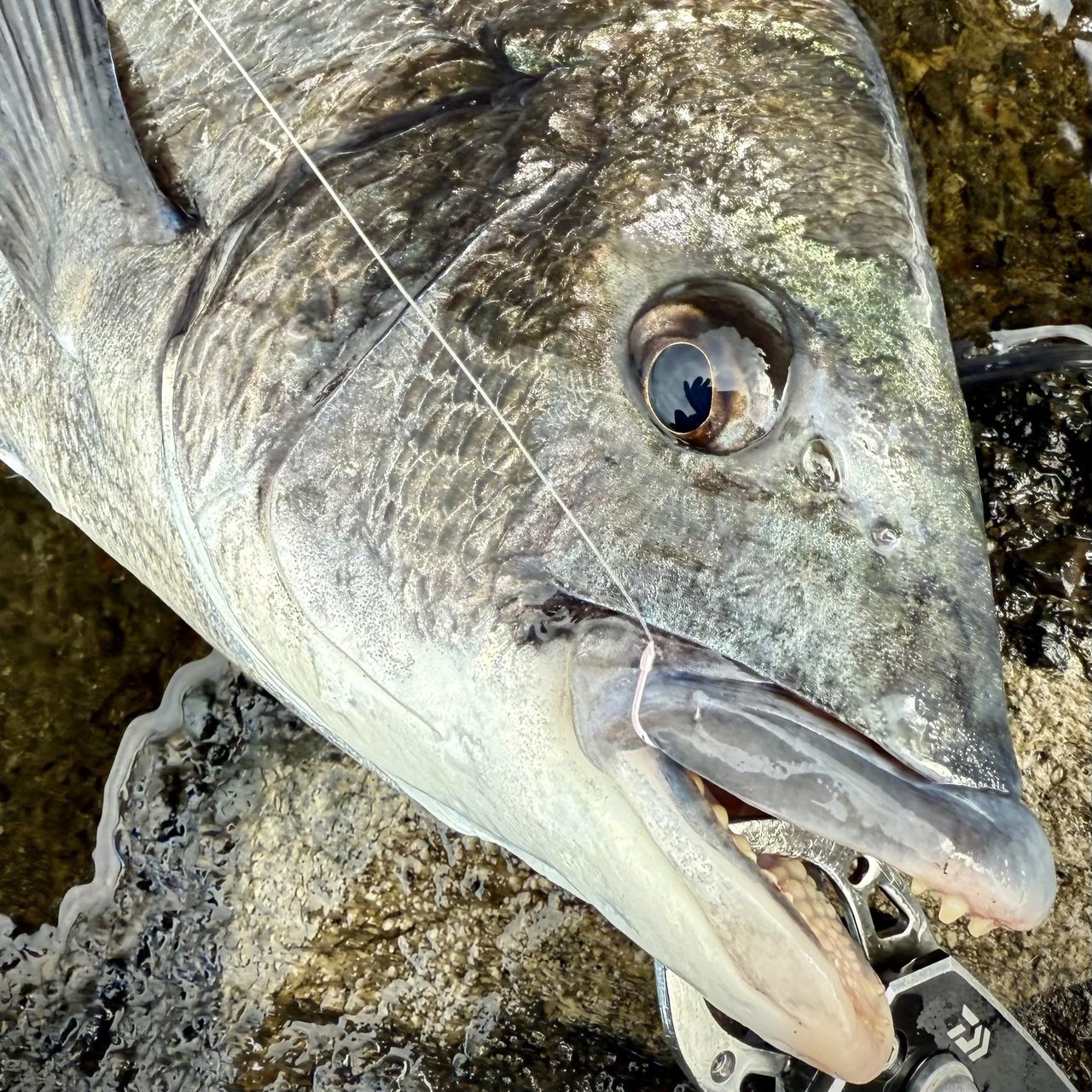ふと振り向くと同行の雪下さんが黒鯛を釣り上げていました。