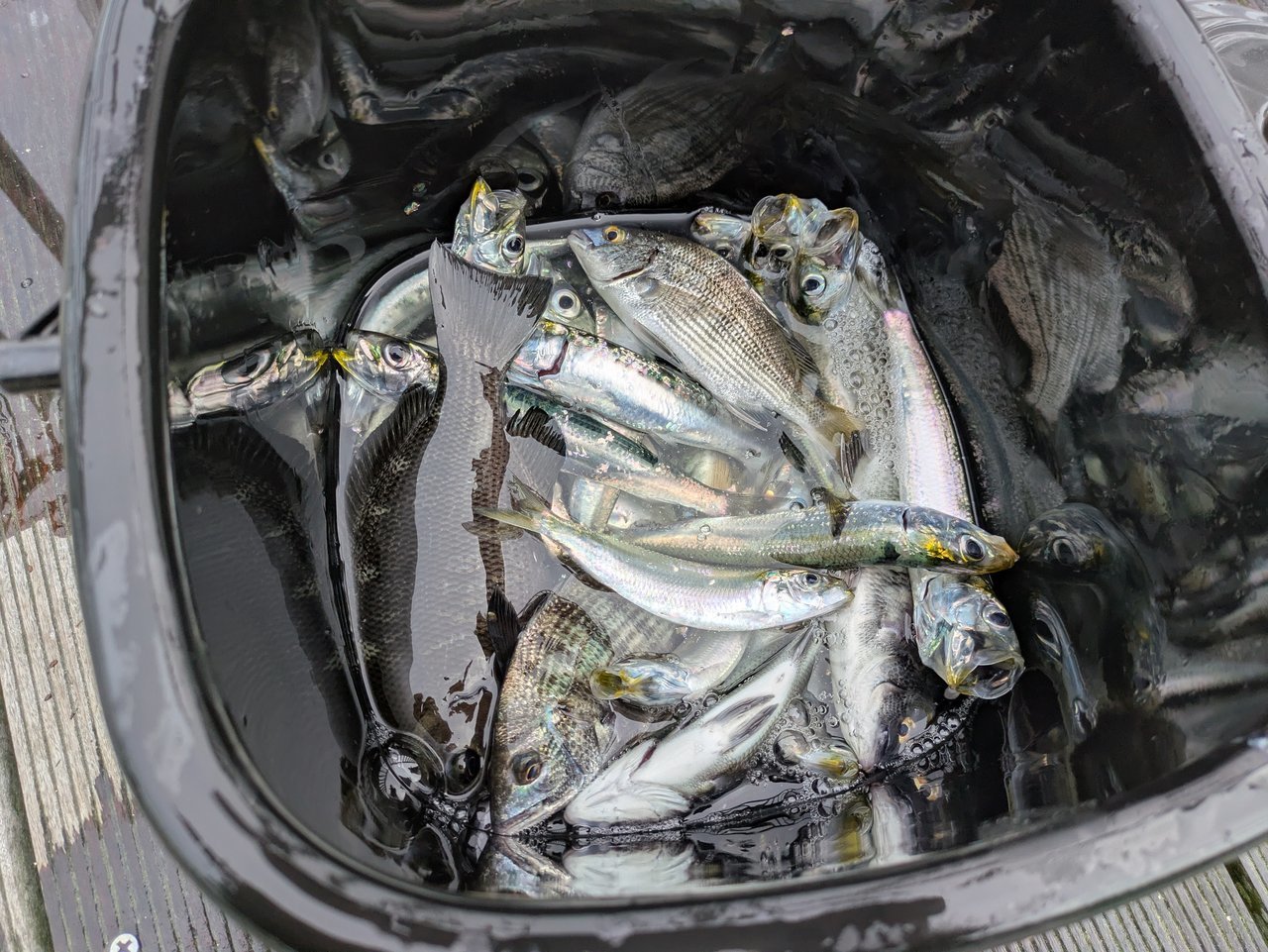 10/31(金)サビキ釣りでのイワシが好調のNX仙台港パークに行ってきました。釣り人の多くはサビキ釣り!やはりイワシをコンスタントに釣り上げておりました。私はメバリングロッド、虫ヘッド、エサにはジャリメとシンプルな仕掛けでデッキの際狙います!仕掛けを投入すると早速小さなアタリ!しかし針掛かりしない!!この繰り返しに仕掛けを変更。忍ばせておいた袖針、ガン玉でシンプルな落とし込みしスタイルに!すると早速ヒット!正体は定番ゲストのフグでした!その後もフグばかり。そんなところに偶然にも友人を発見しポイントを移動。(友人はサビキでイワシ狙い)ポイントを移動したのが正解!そこからはチンチン(クロダイの幼魚)+メジナをキャッチ!メバルタックルだったのでファイトも楽しめました!友人はサビキで多点掛けを連発!二人とも満足の釣果となりました。イワシが回遊しているうちにサビキ釣りを楽しんでみてはいかがでしょうか?