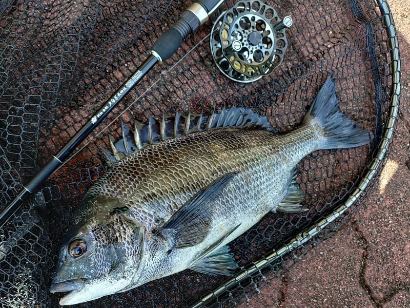 フグも気配ないし、エサも少し齧られつつ残って後は本命待つのみなんて思いつつ、その30分後にウキが消込み合わせるとイイ感じの引きでクロダイ登場!