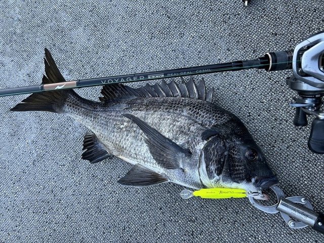 前日の夜から降り続く雨の中出船。近場のシーバスポイントからスタート、ストラクチャ―のスタックに気を付けながら鬼丸を巻いてくると、足元付近でバイト!!向こう合わせ的にフッキングし、上がってきたのはフッコサイズのシーバス君♪♪その後、引き続きストラクチャ―周りをタイトに攻めていると、軽くスタックしたルアーが外れて瞬間に「ゴゴッ」とバイト!!変わった引き方を感じながら上げてくると、40cmほどの黒鯛でした♪♪幸先いいかと思いきや、ここで急ブレーキ・・・。