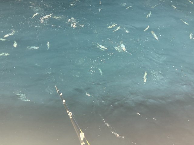徐々に北上しながらベイトを見つけながら投げていると、待望のHIT♪♪結構引く!!!途中で止まらない!タチウオじゃない♪なんて話しているとサバのチェリー!!結構パンパンで良型でした!