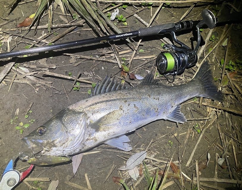 最近ボイル多発ポイントへ移動。今回もボイルは時折発生しておりいい状況。このパターンに調子のいいサーフェイスコントローラー80をキャストするとすぐにヒット。レギュラーサイズをキャッチ。その後いろいろルアーを試すもやはりサーフェイスコントローラー80の独壇場。しかし潮が緩いので流れているタイミグを見計らってのキャストなので、コンスタントにヒットという状況ではなく3本キャッチで潮位的に終了間近。その時は突然に!サーフェイスコントローラー80を対岸際にキャストし、少し流し込んだところでヒット!デカい!それでもスモールベイトのパターンなので80半ばを想像して手前に寄せると規格外の大きさ!ヘッドライトの明かりでスイッチが入り大暴れ!ストラクチャーは少ないのでフック伸びを気を付けドラグは緩めに・・・何度か走られながらも慎重に寄せ無事ランディング。