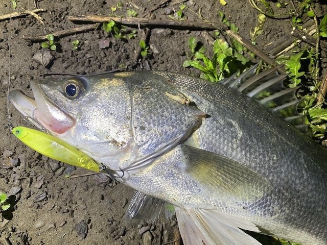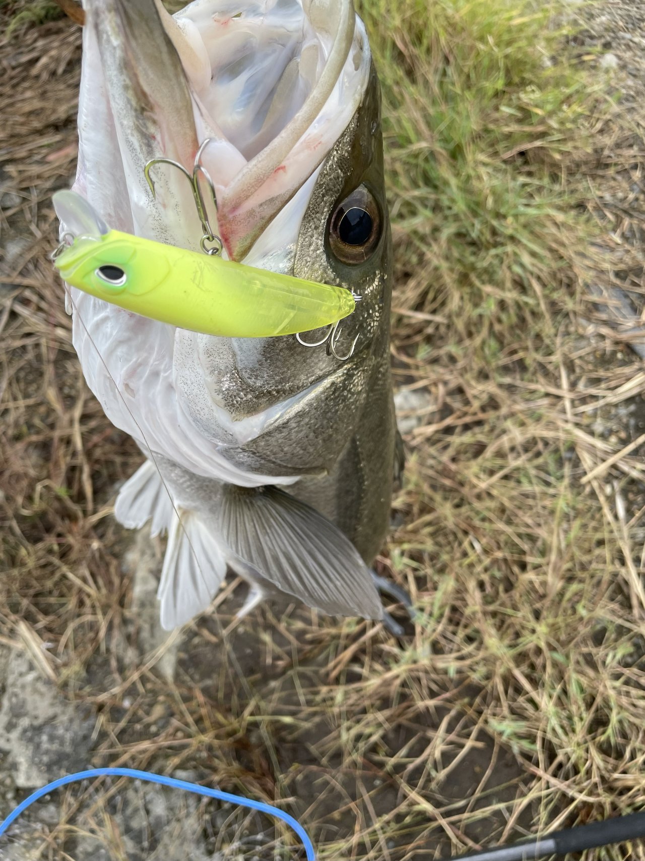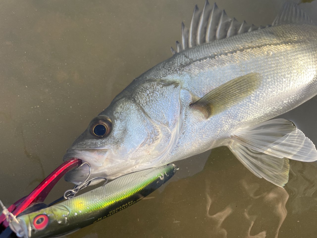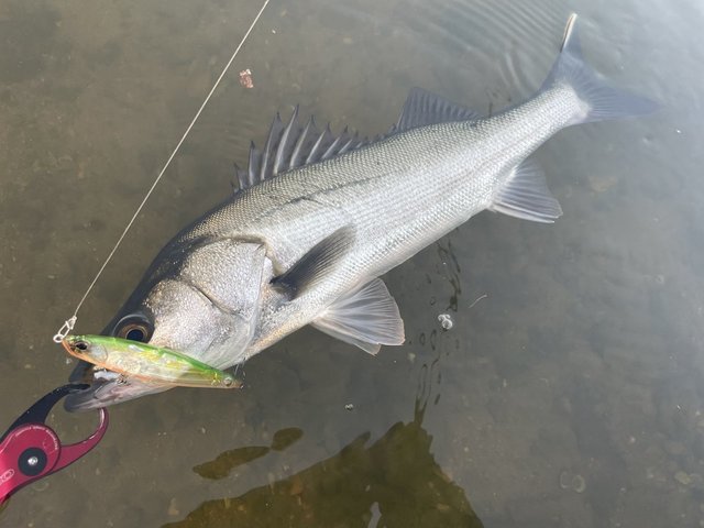 今日はダメかなと思いながらもシマノ『トライデント90S』を流していき、緩い流れの中でも一番流れが効いている場所を探しながらキャストしていくと巻き抵抗重くなったなと思った瞬間バイト(笑)40cmくらいですが可愛いサイズがヒット!そこから同じコースで連発!!最後に55cmの良い個体が釣れた所で流れが緩くなり終了!!ダメ潮でも釣れるタイミングはあります!!皆様も是非!!!