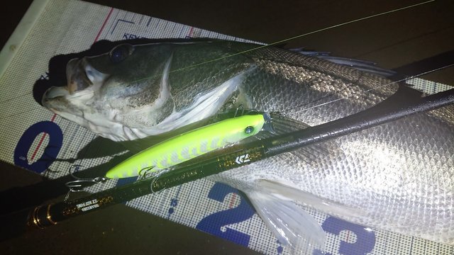 今回もシーバス釣りです。仕事が終わってからの釣行です。23時誰もいません。水面は少しざわざわしています。1時間アタリがなかったのですがボイル発生、そこにセイラン130Fをキャスト、ヒットです。40センチのフッコゲットです。またボイルしヒットです、今度は引きますサイズアップ60は超えていますがランディング失敗で残念、気を取り直して前回釣れたエンバシー90に変更、すぐにヒットフッコゲットしましたが雨が降って来たので、セイランで1匹追加して帰りました。明日はデイゲームです。