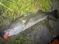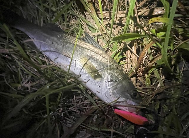 ポイントはいつもの場所で。ここ毎日当たっていたルアーを通すも、今日は当たらず。次はどうするかとキャストを続けていたところ、10mくらい横の岸際で突如爆発音が!間違いなくシーバスのソレ!トリックアッパーに変更→そっと奥にキャストし、カラカラ...カラカラ...爆発!!トルクのある引きを魅せて上がってきたのは64cmのシーバス!ハーモニカ食いで上がってきました!