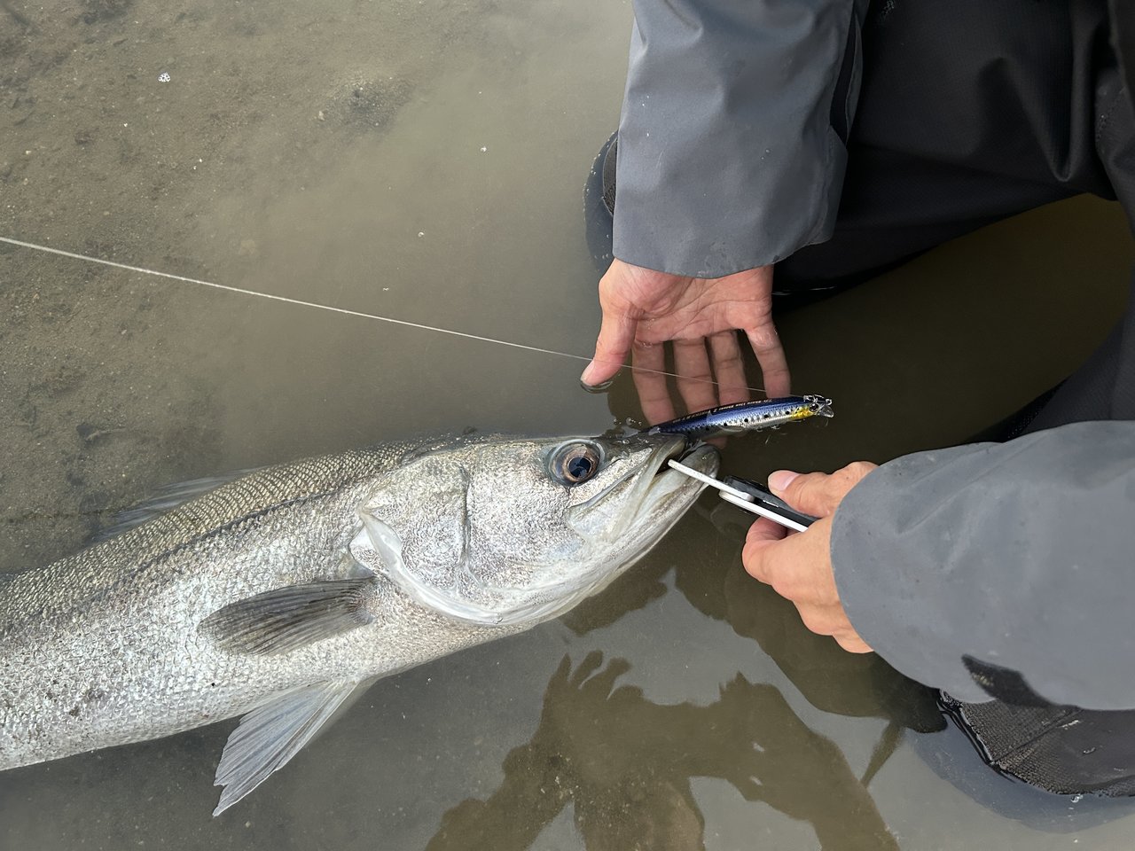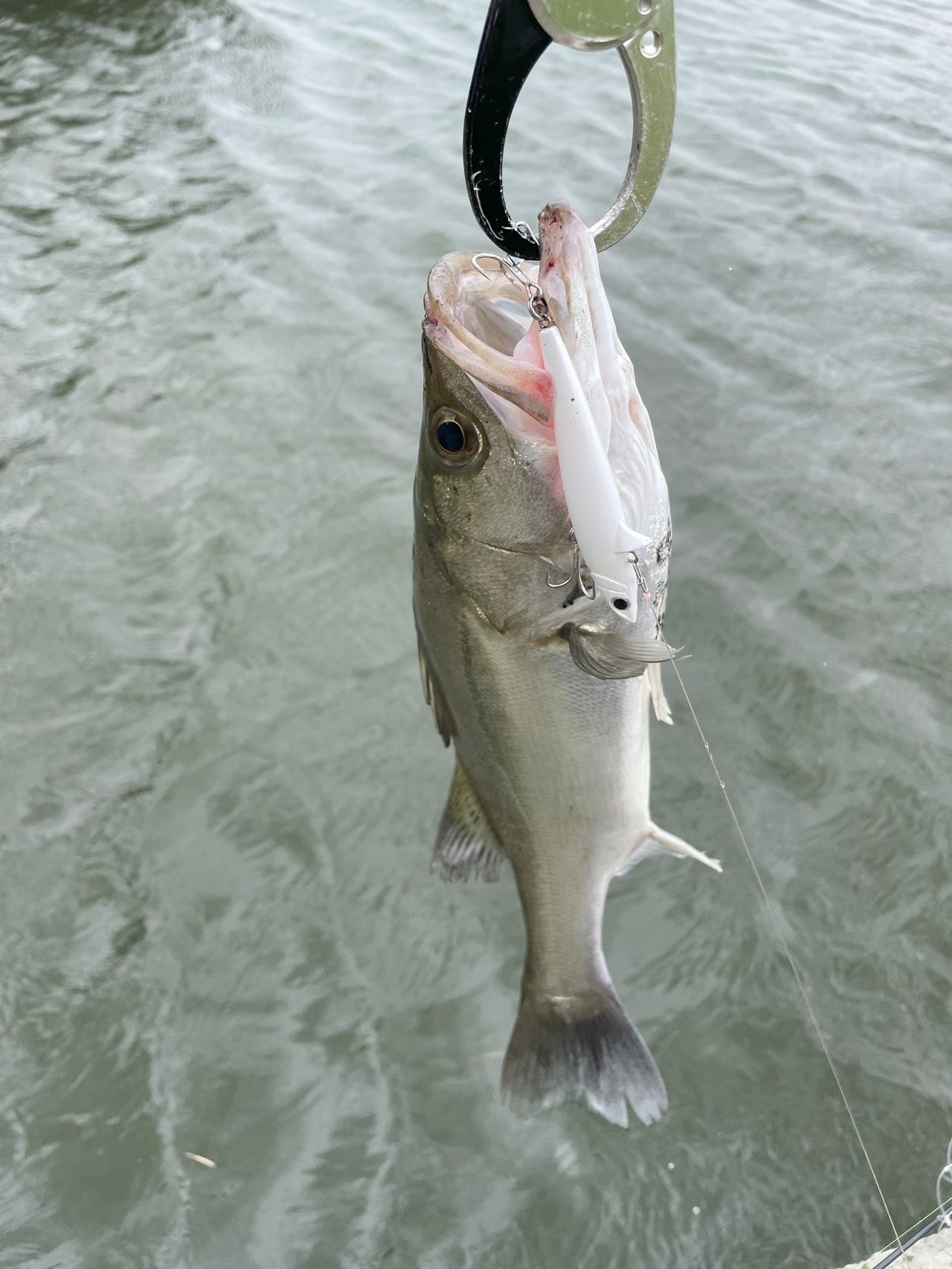 セイゴを乱発していると、たまに足元を白くて大きな影が泳いでいる…