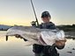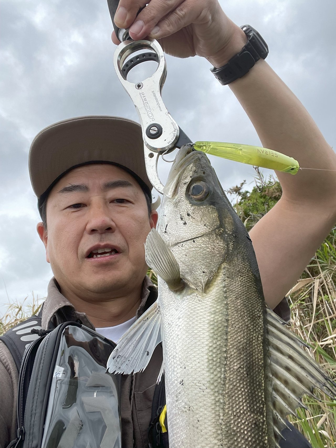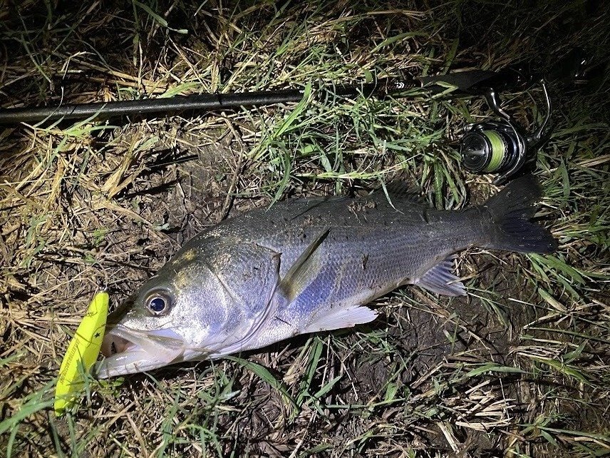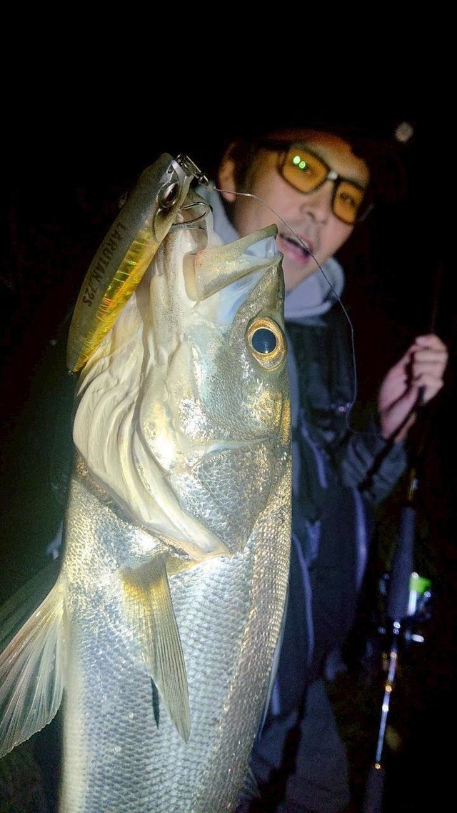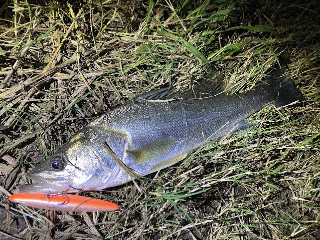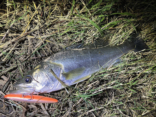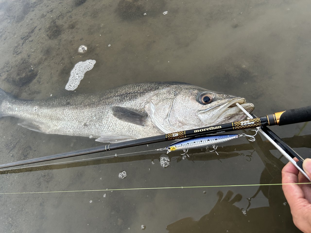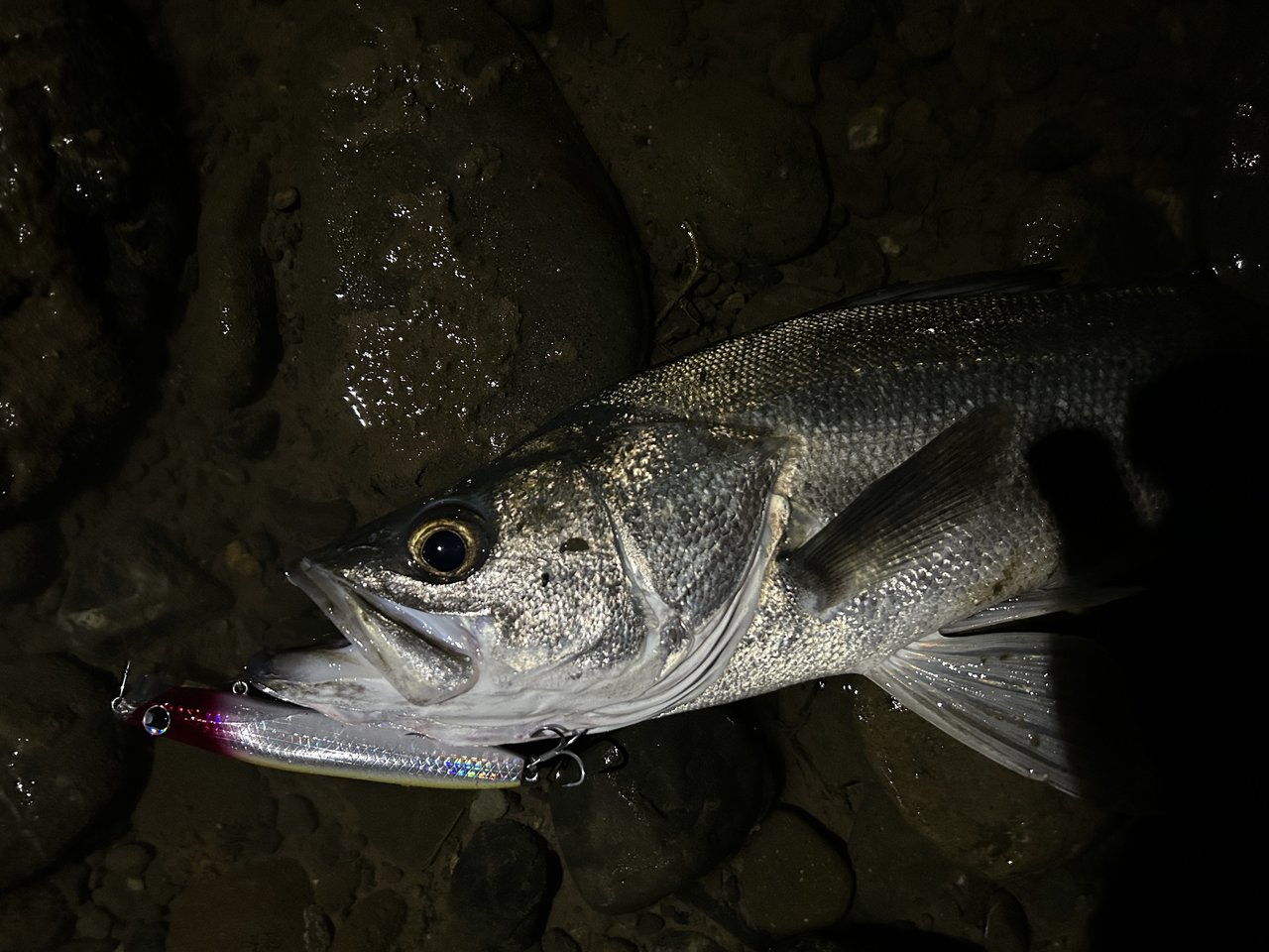河川の明暗部に下げ潮でエントリー。ベイトがおり、ボイルもある状況の中、簡単には喰わないシーバス。何とかゆらぎアクションのレクター131FBOLDで60㎝クラスをキャッチできましたが、後が続きません。朝マヅメ、最干潮からの上げ潮に代わり、ミオ筋のブレイク狙いでようやくグッドサイズをゲット。ショアラインシャイナーZバーティスのやや早巻きが効きました。まだまだ体が細く頭でっかちの体型、これからが本番かなといった感じでした。