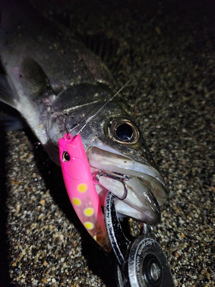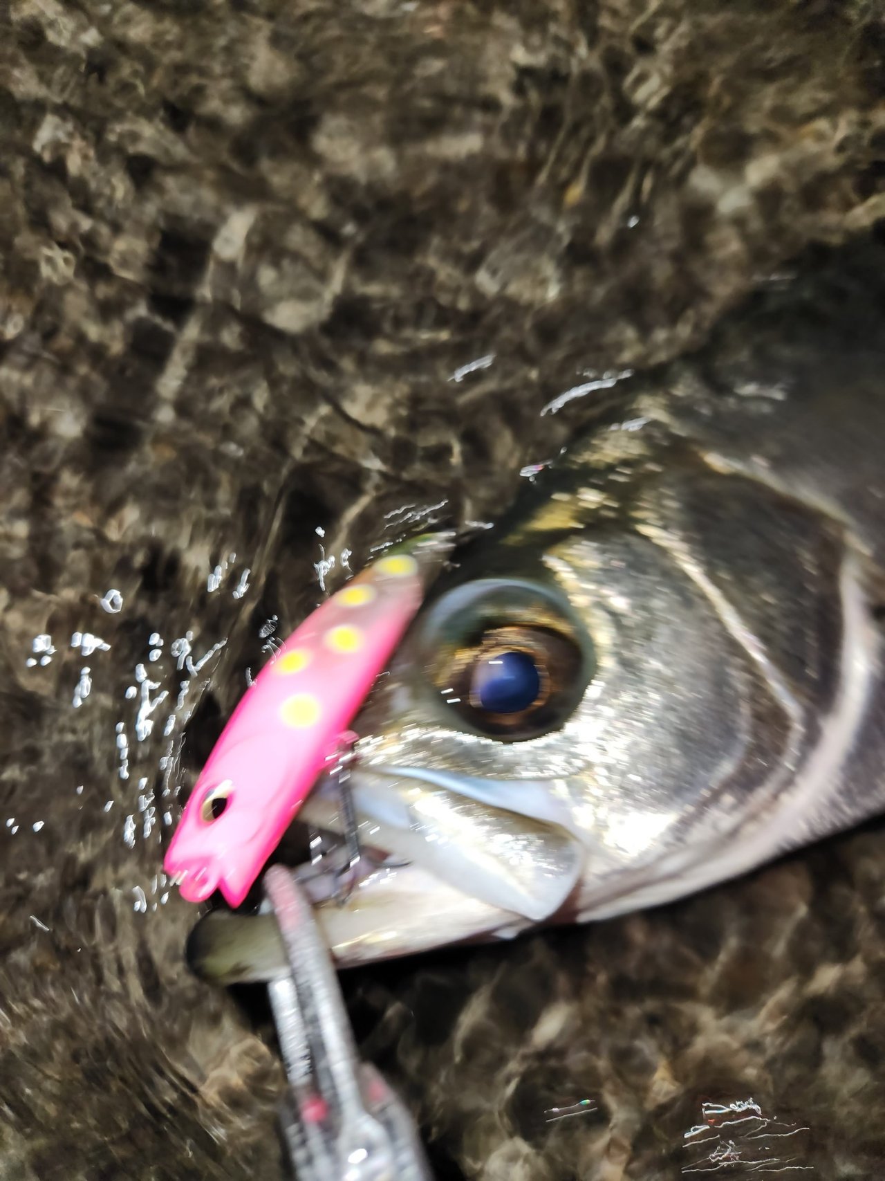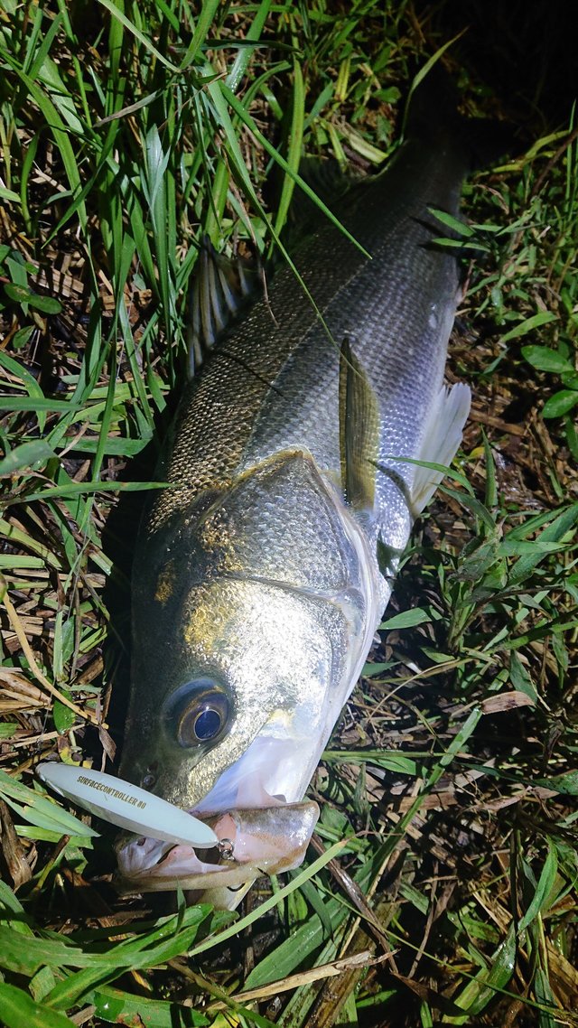 連続釣行二夜目は魚を探しに湾奥へ。久しぶりの場所、久しぶりの仲間との釣行とあり会話が尽きない内にゆっくりエントリー。ベイトはアミやイナッコを確認。広大なエリアで地形と流れを探ると良さげな反転流を見つけ丁寧にサーチ。しばらくして遠く離れた場所の方が魚を上げたので、時合と判断し必殺のサフェコンで良い感じに流れを捉えると、早速チヌがヒット→バラシ。数投後シーバスヒット→エラ洗いバラシ。また次のキャストでシーバスヒット。今度は慎重に寄せてキャッチ!サフェコンが炸裂デス。その後は点々と探りましたが、ノー感じになり納竿。小サイズでしたがやっと釣れたので良かったと思える釣行でした。流れが分かりやすく、オートマチックに誘うサーフェスコントローラーオススメです^_^