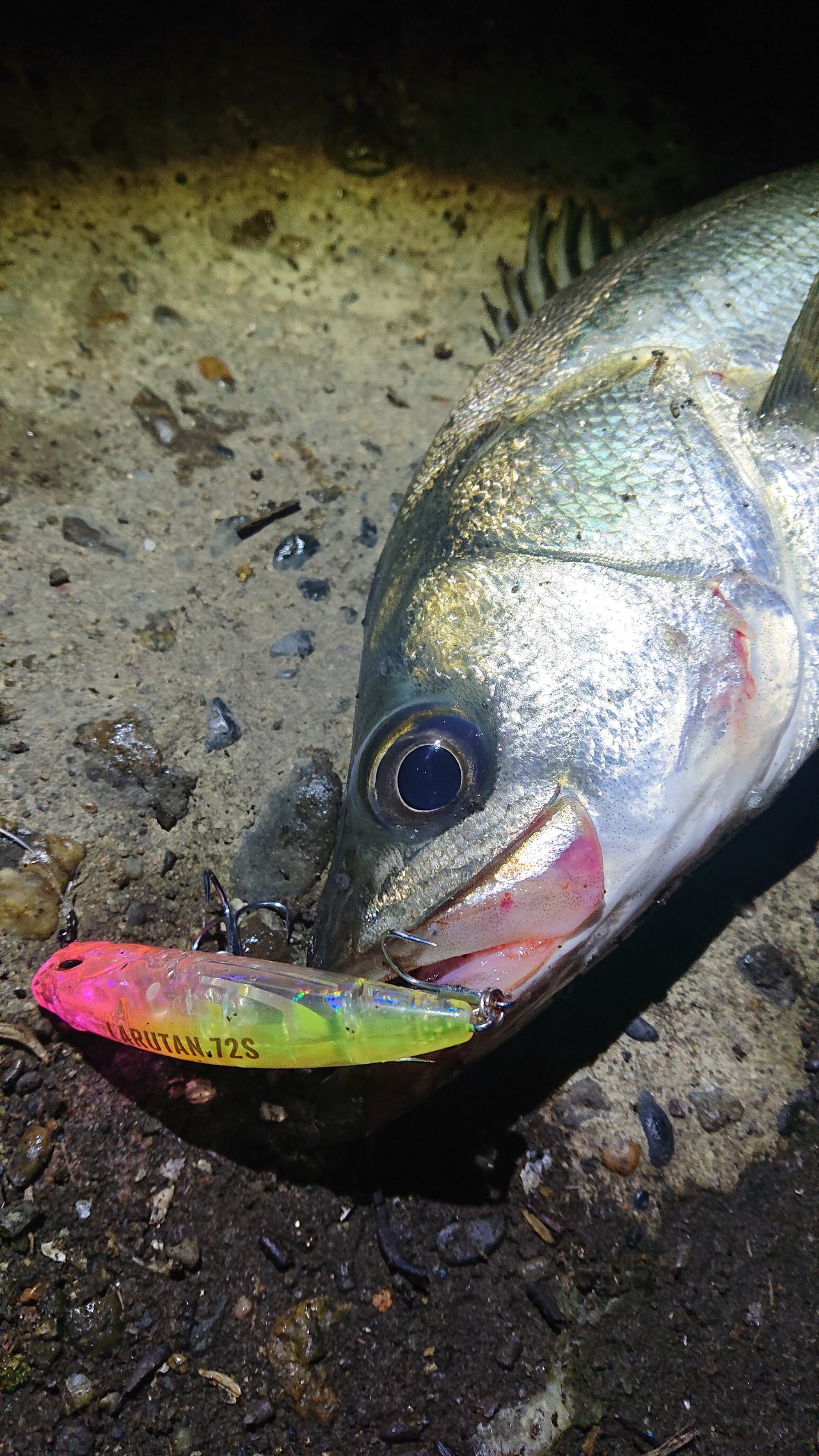 有明方面にシーバス釣行。まずは先週デカいのをバラしたポイントへ。対岸でボイルしているも喰わせられないまま沈黙したので早めに見切り移動。橋の明暗でボイルしまくっているポイントを発見。これはもらったとセイランやサーフェイスコントローラー118Fをはじめ、12cm前後のルアーをいろいろ試すも反応なし。大き目のベイトを想定したので、手持ちの小さめのルアーはラルタン72Sとサーフェイスコントローラー80のみ。ボイル祭りは継続中の中、まずはラルタン。魚にスレて当たるもバイトなし。続いてサーフェイスコントローラー80。流し方、速度を調整。アップにキャストし、リールをほとんど巻かず、先行したラインのテンションで漂わせる様に明暗に流した時に遂にヒット!60cmくらいの魚をキャッチ♪パターンが分かったら後は入れ喰いモード突入。50~60cmアベレージで15本程キャッチ。途中で写真を撮るのをやめるくらい怒涛のラッシュ。最後は手間のヌカるんだ立ち入れない潟が広がり取り込み困難ギリギリの潮位で75cmの本日最大魚もキャッチ!まだボイルは続いていましたが、魚をキャッチ&リリース出来ない潮位になり強制終了。全身ドロまみれになりましたが熱い夜でした♪
