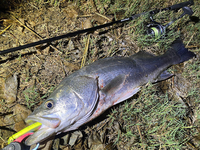 先日のビックサイズ2バラシのリベンジで一昨日はオフショアジギングの前に釣行し、また良型をヒットさせるもランディング寸前でフックが伸び痛恨すぎるバラシ。悔しすぎて眠れないので、仕事終わり23時半に有明方面に出発。満潮前後を狙いましたが、潮が悪く流れが緩すぎるのと狙いのブレイクまで水位が無い状況。想定した流れが出ないまま反応はワンバイトのみ。2時半頃に諦めて帰ろうしたところで突然ヒット!しかしレギュラーサイズ。ランカーリベンジにはなりませんでしたが渋い中嬉しい1本。ちょうど流れ出しのタイミングでした。やっとの流れなので30分延長。しかし後が続かず3時。朝から出勤なので撤収。リベンジ燃えて不思議と眠たくないです(笑)