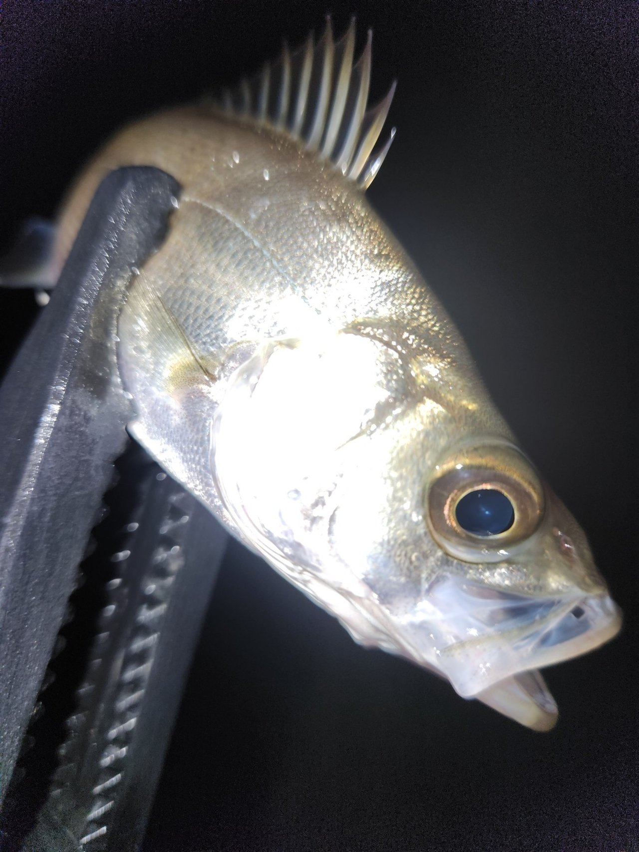最近通い始めた釣り場の下げ始めから明暗へ。イナッコが浮いており、シーバスのボイルも発生している状況。水面直下のレンジで、ウェイク系のリバンク99、ゆらぎアクションのレクター111Fにバイトがあるもののフックアップせず。ルアーローテーションしながら流すコースを調整していると、手前のコースの暗部でガルバにヒットしました。フッククラスでこのサイズが多いようです。