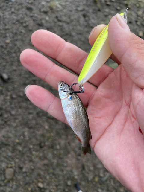 空いている生命感のあるポイントを見つけるもシーバスの気配なし。早めに見切り移動。シーバスに追い回されるはずの5cmくらいのハクが溜まっているポイントにエントリー。最初はプラグで攻めるも上の層は反応なし。トップゲームを楽しむはずが・・・