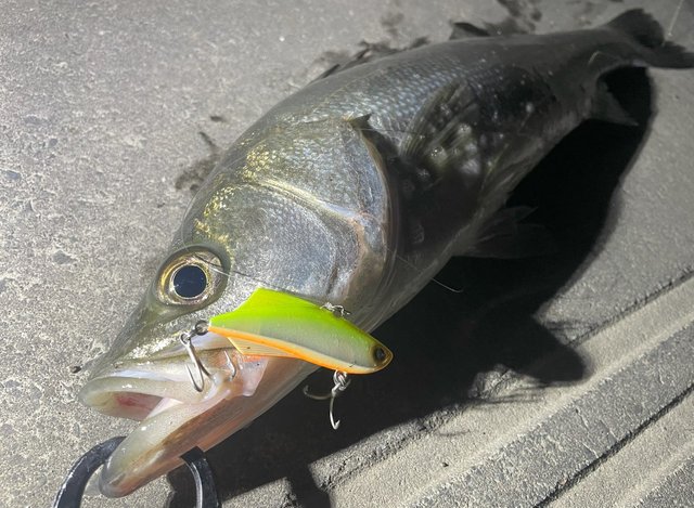 こんにちは!泉バイパス店佐藤です。仕事帰りにどうしても竿を振りたくなり30分勝負でシーバスに行ってきましたよ!!タイミング的に上げ止まり前で少し流れ効くの期待してポイントに入るとやはり流れがある!!シンペン広範囲を探るもバイトが無く、魚の活性は低い状況。それならリアクションで探る為に「キックビート」のちょい早巻きでブレイクラインを丁寧に誘うとブレイクの切れ目でヒット!!サイズは55くらいでしたが嬉しい一本でした。流れが緩く活性が低いタイミングはバイブの投入も効きますね!また行っていきます!!