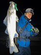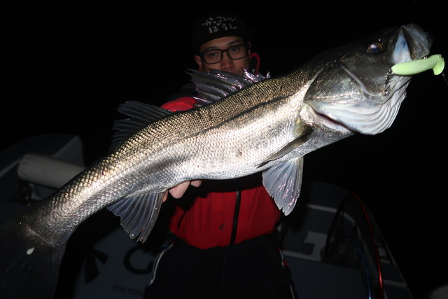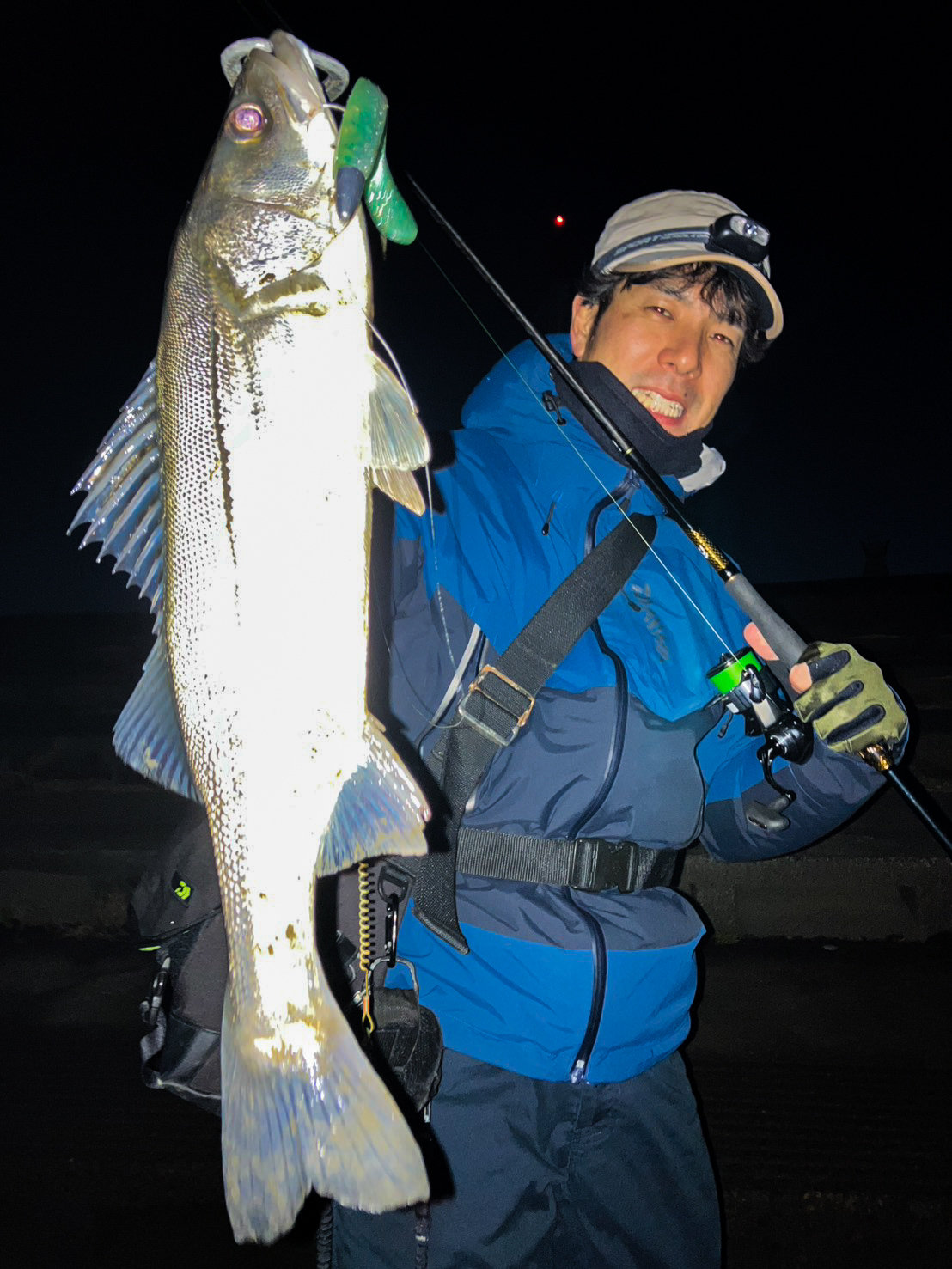 あと少しが届きません。隣で轟音を立てながら全力キャストしているスタッフ上條にヒット。早速今年初シーバスをキャッチ。