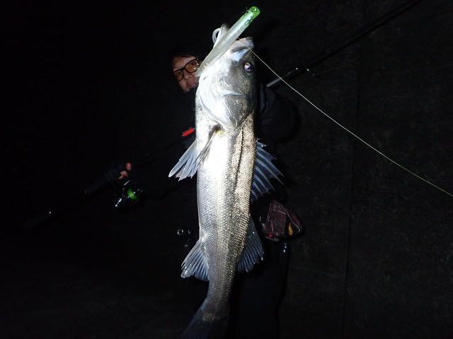 その後、ちょっとだけラインを変えて探っていると、さっきより重たく強い流れを発見・・・と、思った直後、引ったくるアタリ。重い首振りをいなして寄せてくると、厳つい頭のマッチョなシーバス。岩場にズリ上げランディング成功!大晦日に次いでランカー捕獲、うまく行きすぎてなんか怖い(笑)。