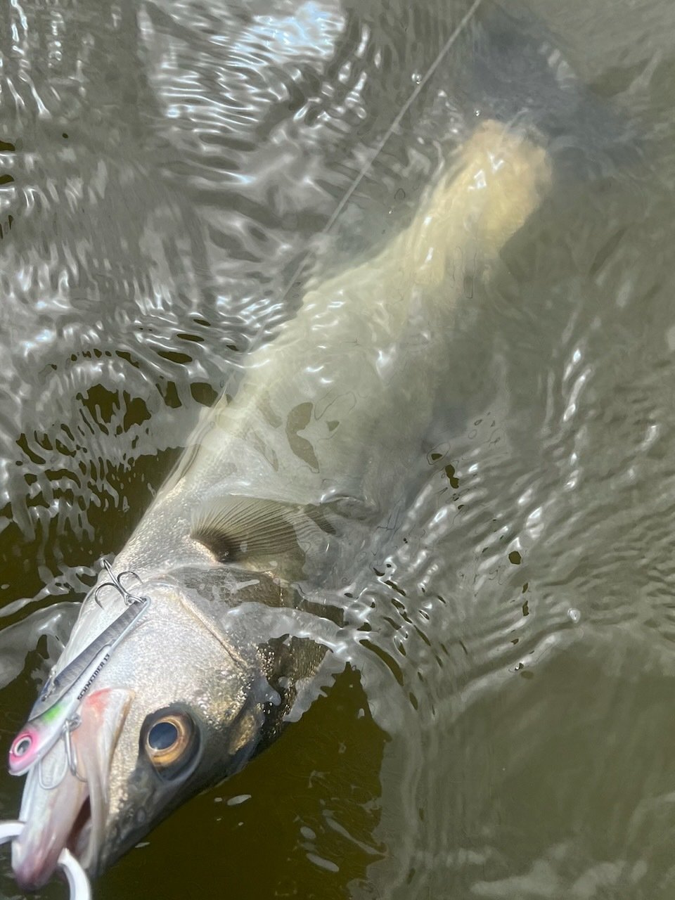 スポットでハクの群れが泳ぎ時よりシーバスの捕食を確認。