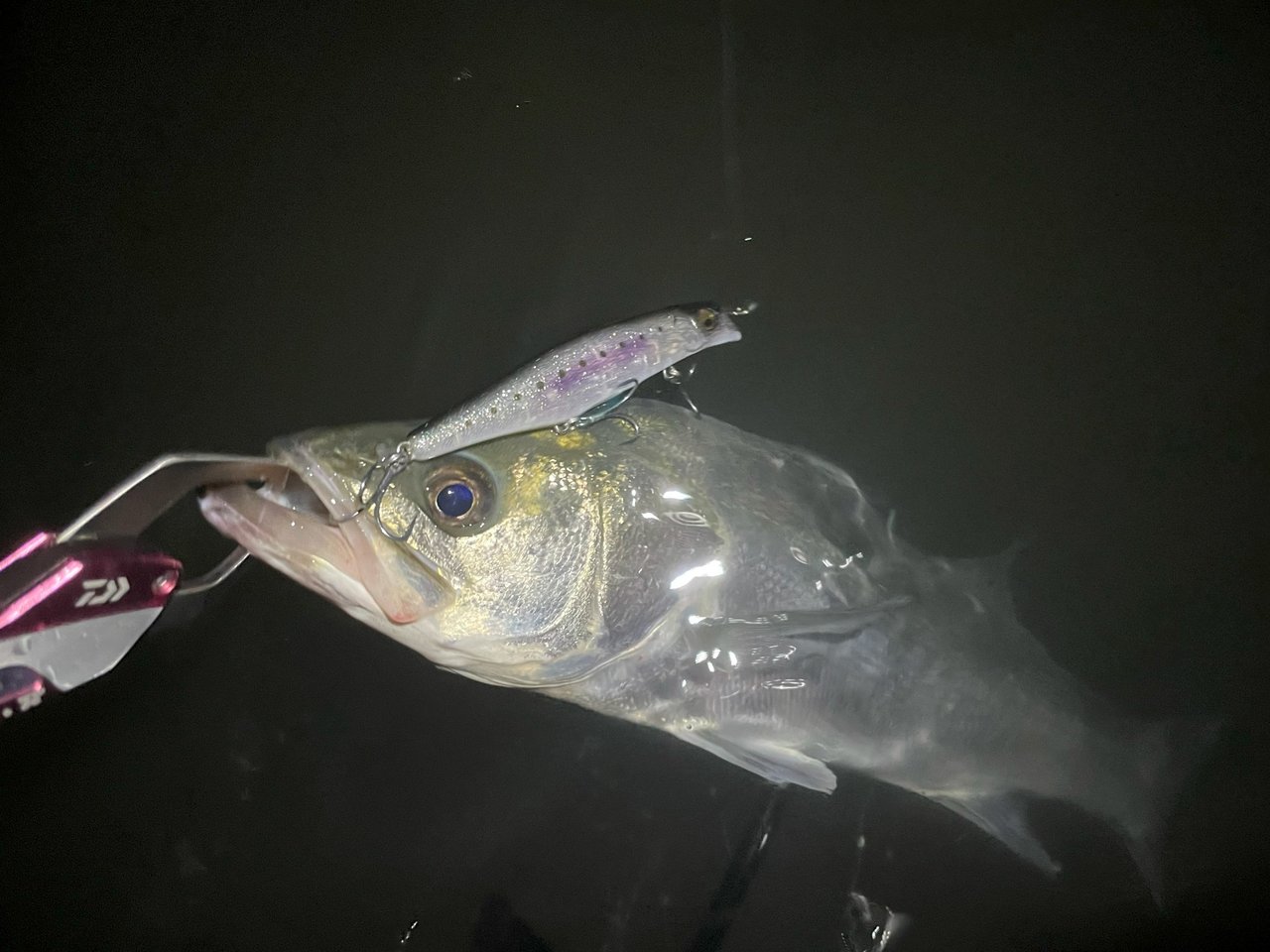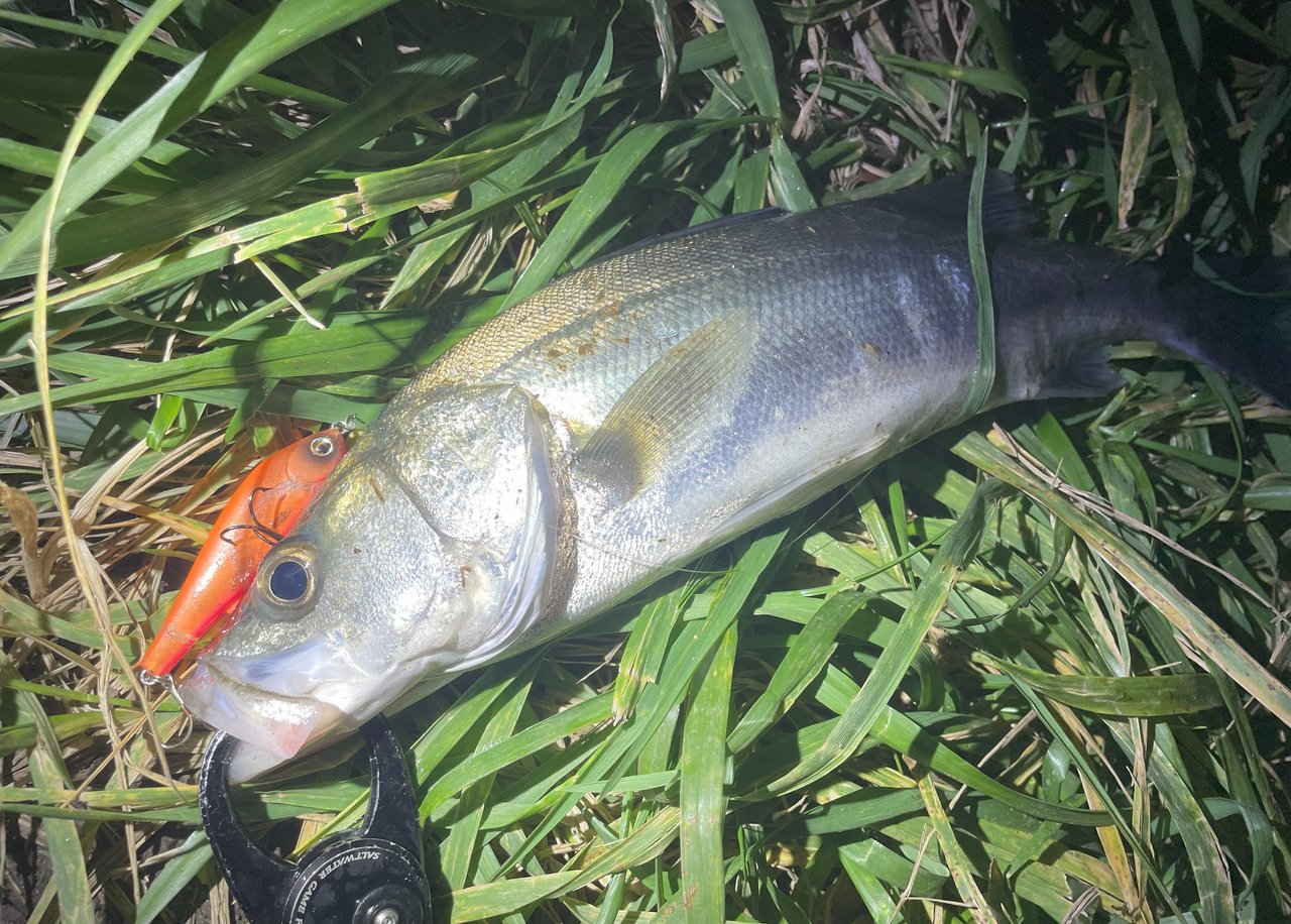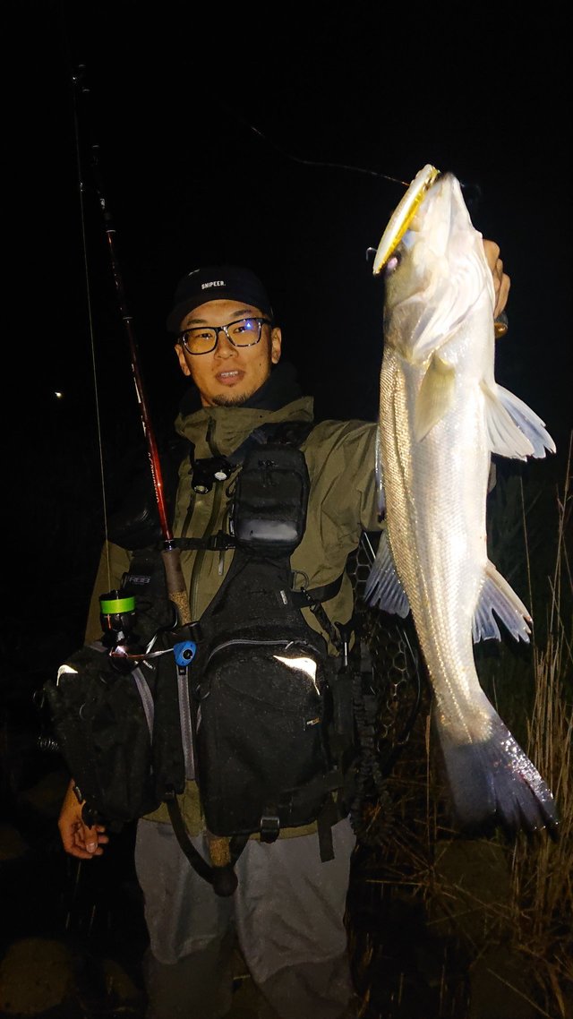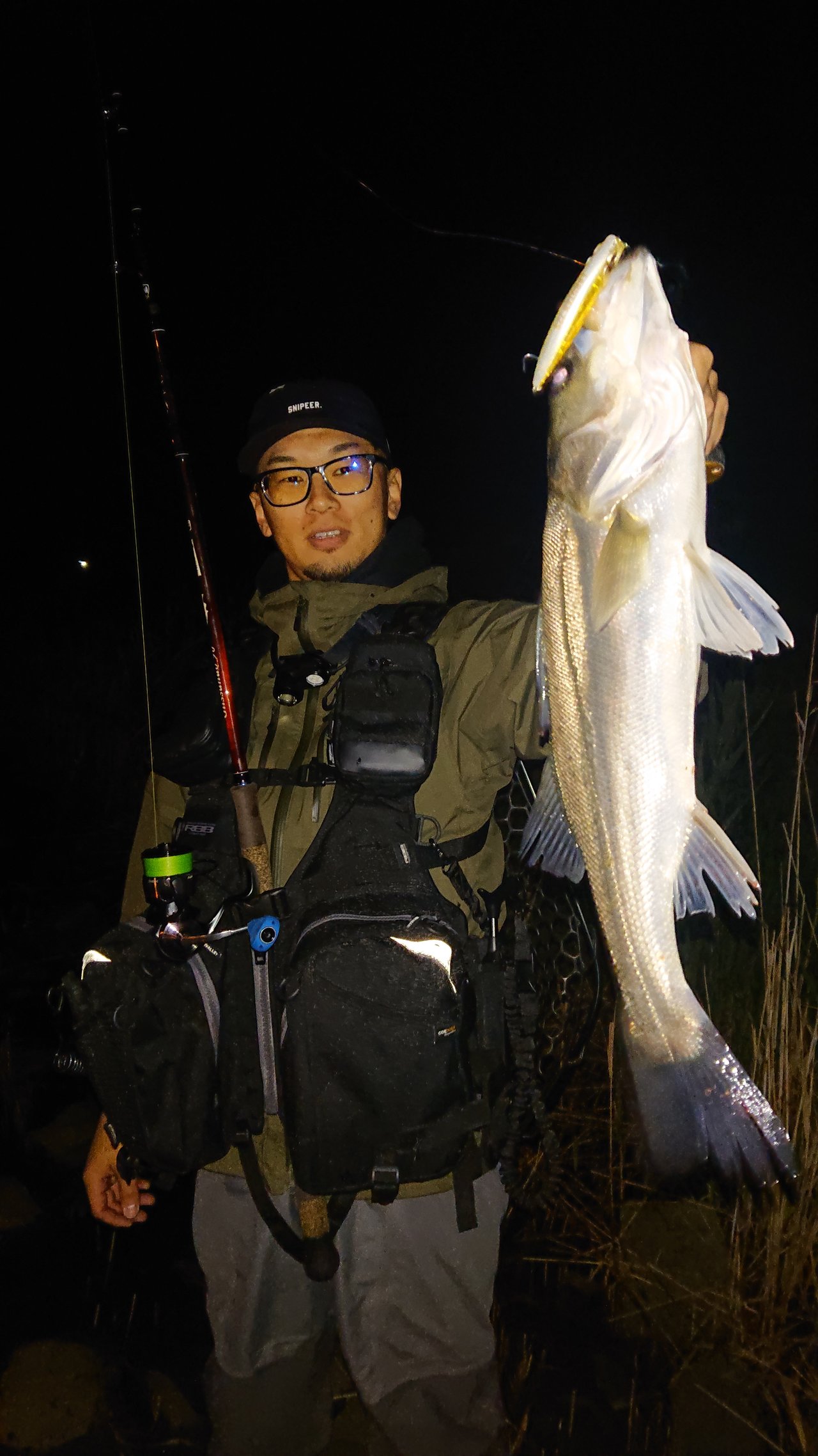下げ潮ほぼ終了のタイミングでポイント入り、少し流れはあるがルアーはほぼ流れないくらいの状況!少し水深のあるポイントに望みをかけてキャストしているといきなり突き上げバイト!!しっかりフッキングを決めると良い個体のシーバスがヒット!!手前が浅く寄せるのに苦労しながらもなんとかキャッチ!LONGIN『レビンミニ』強いですね!!満月で月明りが出ているタイミングは特に「ブラックキャンディー」が釣れますね!月明り対策にブラック系のルアーもあると戦力になりますよ!!是非お試し下さい!