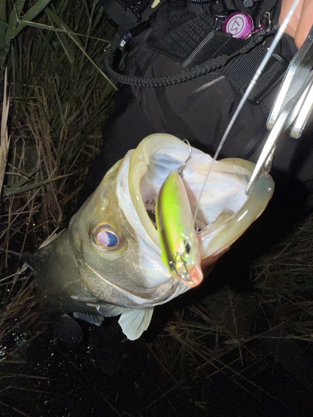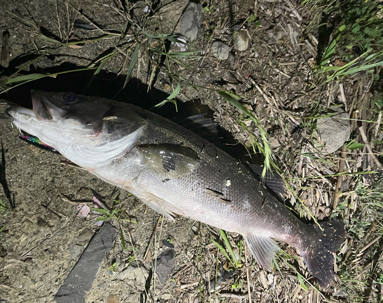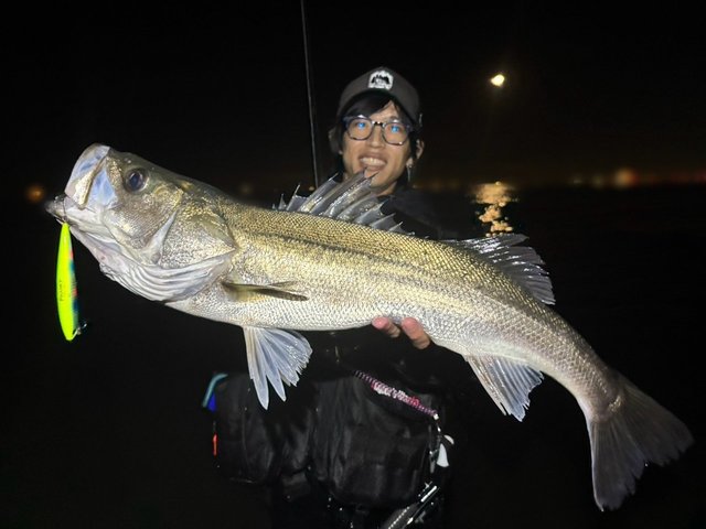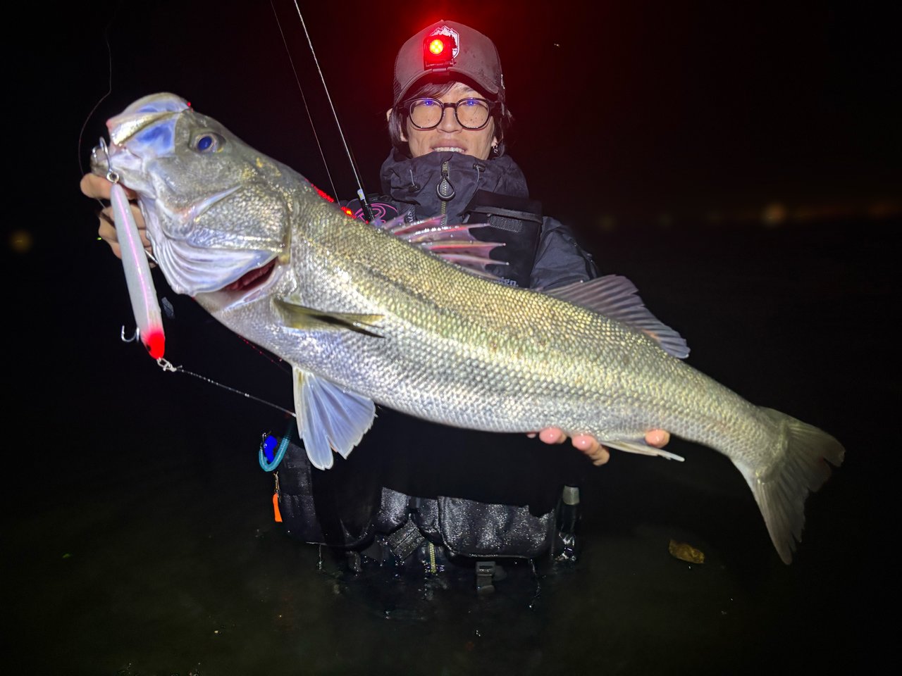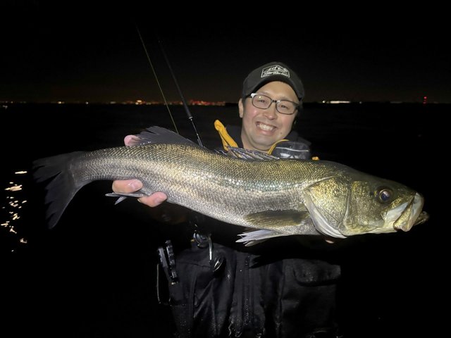 下げ潮ほぼ終了のタイミングでポイント入り、少し流れはあるがルアーはほぼ流れないくらいの状況!少し水深のあるポイントに望みをかけてキャストしているといきなり突き上げバイト!!しっかりフッキングを決めると良い個体のシーバスがヒット!!手前が浅く寄せるのに苦労しながらもなんとかキャッチ!LONGIN『レビンミニ』強いですね!!満月で月明りが出ているタイミングは特に「ブラックキャンディー」が釣れますね!月明り対策にブラック系のルアーもあると戦力になりますよ!!是非お試し下さい!