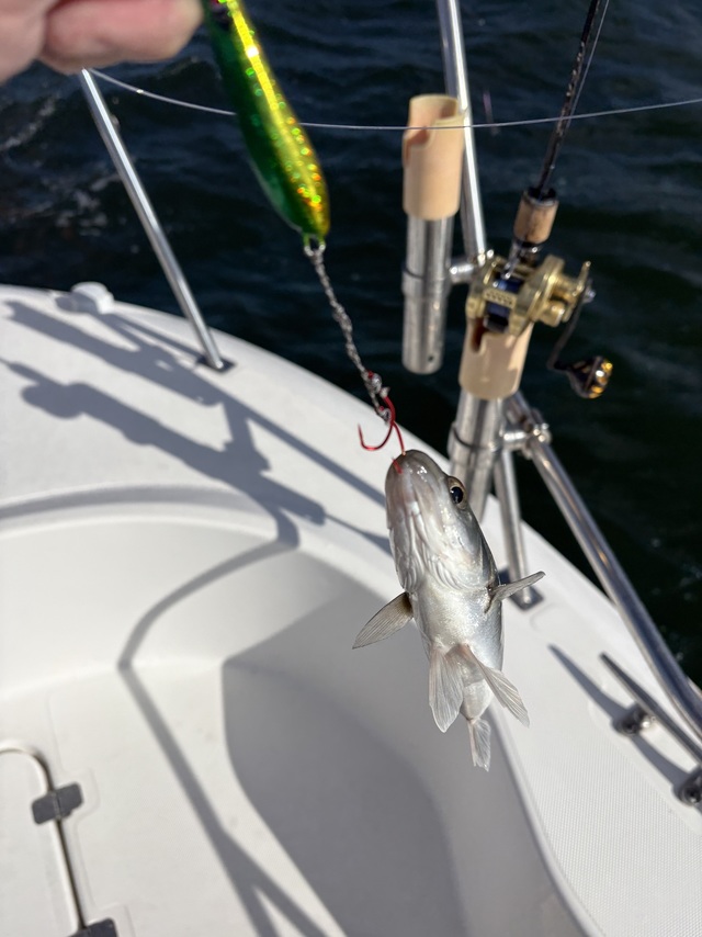 終盤に深場に行ったので、ダメ元でジギングをやってみたところ小型のシーバス祭りに当たりました!!