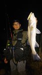 時合いを逃すと釣れないとのことで、アルバイトの清水君にポイントの情報を聞き、いざ釣行スタート!!実績のあるバレーヌ125Fを投げ倒します。ベイトが入ってきたタイミングでポイントを譲ってもらい、アドバイス通りにルアーを通すとゴンとアタリがありシーバスがヒット!!慣れないウェーディングでへっぽこランディングになってしまいましたが何とかキャッチ。久しぶりのシーバスを釣ることが出来ました(^^♪