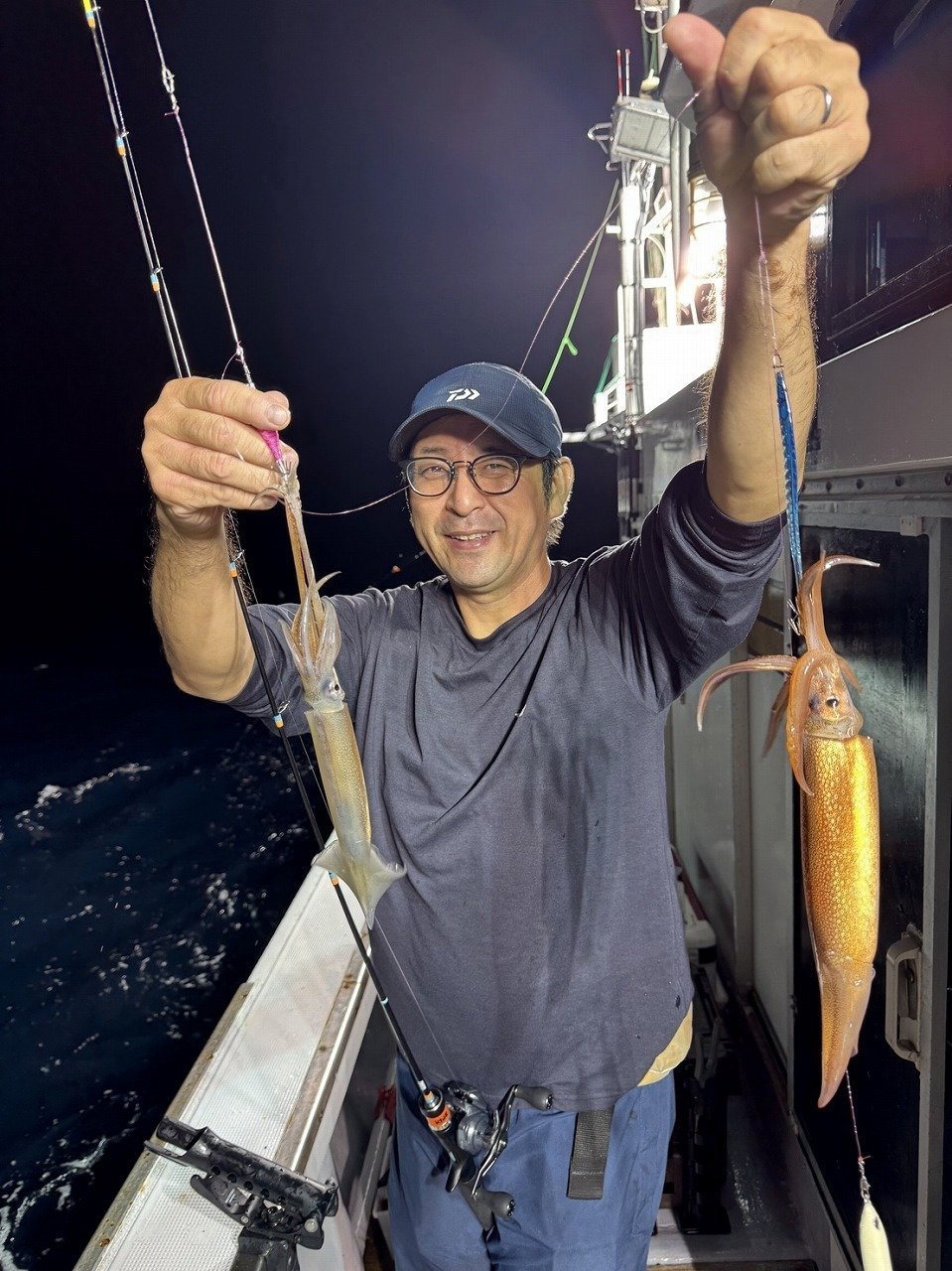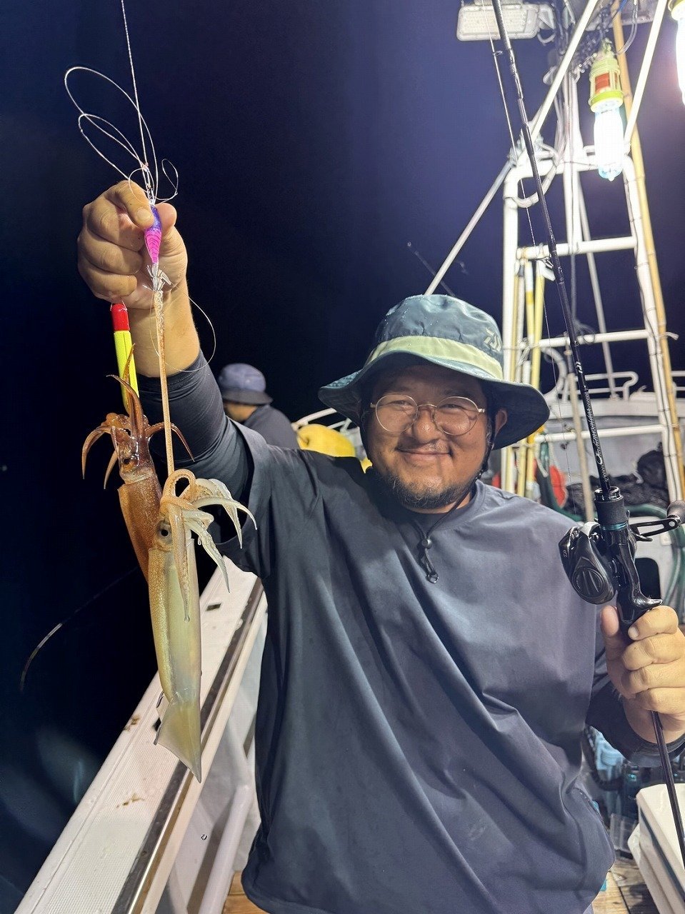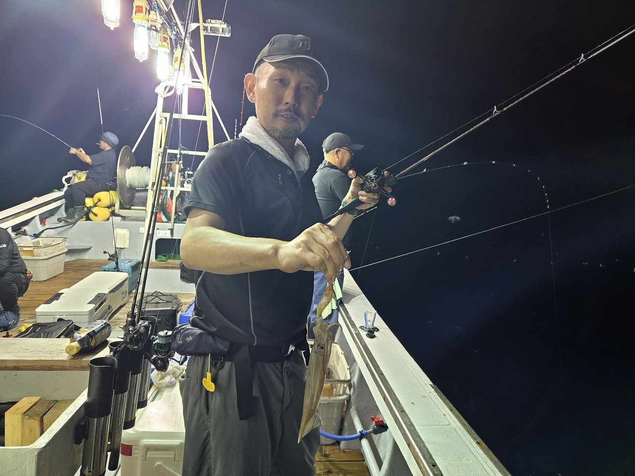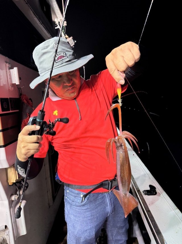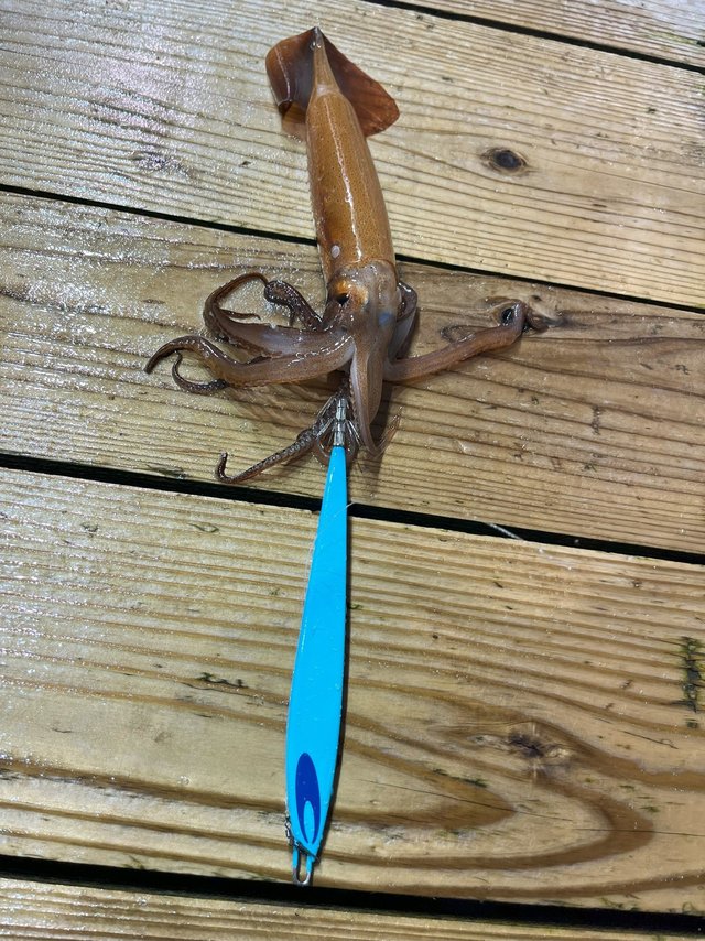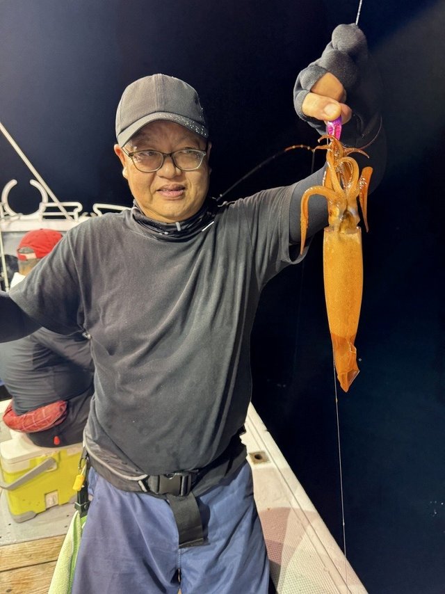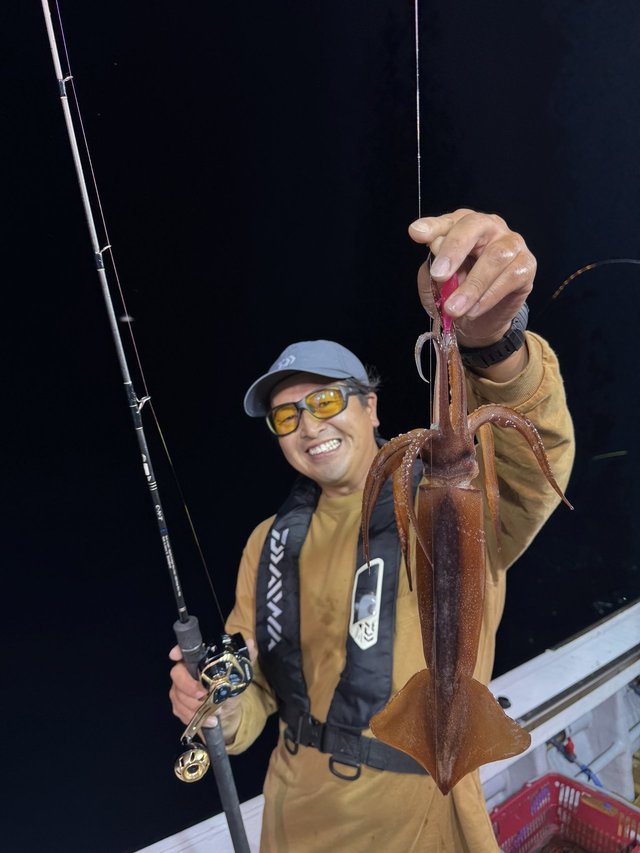 その後は船中でもなかなか浅ダナで掛からず、船長が水深60m付近まで落としたらスルメ釣れるかも~そっちでもいいよ~との事だったので、すぐに20mから60mまで落として誘いあげるとスルメイカがヒット!