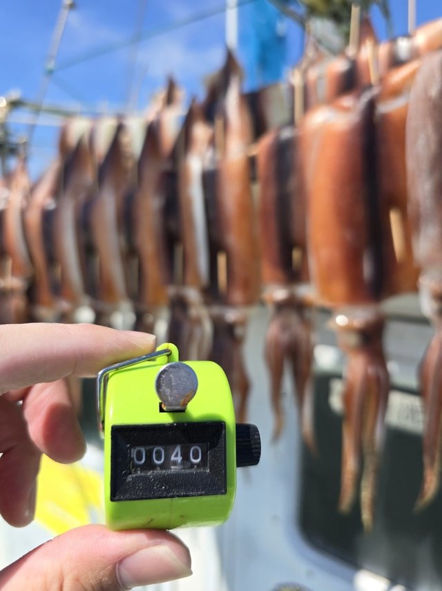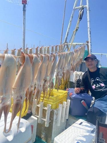 こんにちは、日本橋店の恩田です。最近はスルメイカ釣りにしか行ってないようなが気がしますが、今回も懲りずにスルメイカ釣りに行ってきました!(笑)さて、今回お世話になった船宿は、鴨川港の「第三新生合同丸」より乗船してきました。このところの状況は反応があちらこちらにあるみたいなのですが、活性が今イチで渋いとのこと。でも今日は何か起きそうな感じと思いながら直結仕掛けで釣り開始。すると、イカの気配を察知し、4点掛けや3点掛けもあって好調なスタート。あっという間にツ抜け達成し、その後もまずまずでしたが、中盤に乗り渋りタイム。しかし、この日は後半にイカのやる気が復活。同船者の方々は最大6点掛けもあり、好調になってましたが、なぜか私には単発ばかりで釣果が伸びず、沖揚がりの時間を迎えてしまいました。今後の予想ですが、スルメイカの反応はまだまだ良さそうなので潮次第では、爆乗りも期待できると思います。