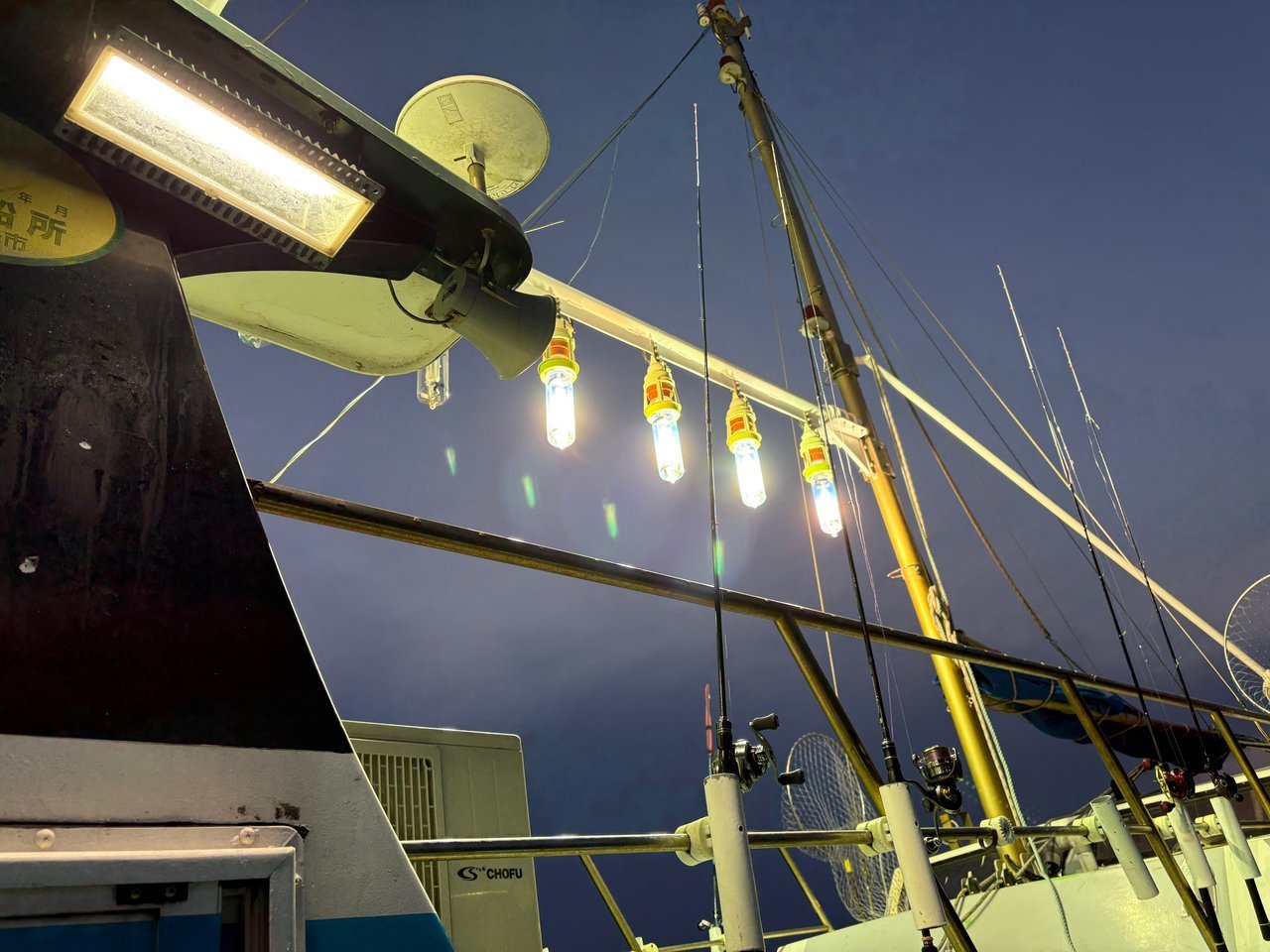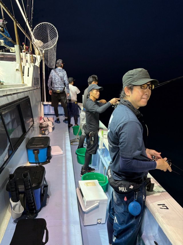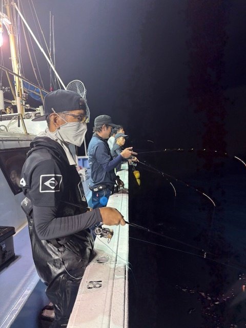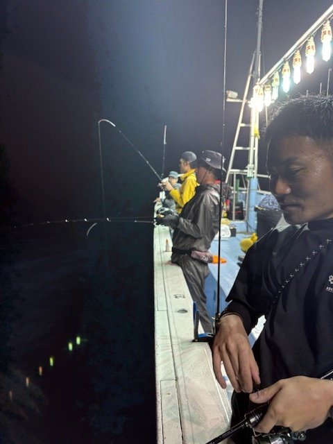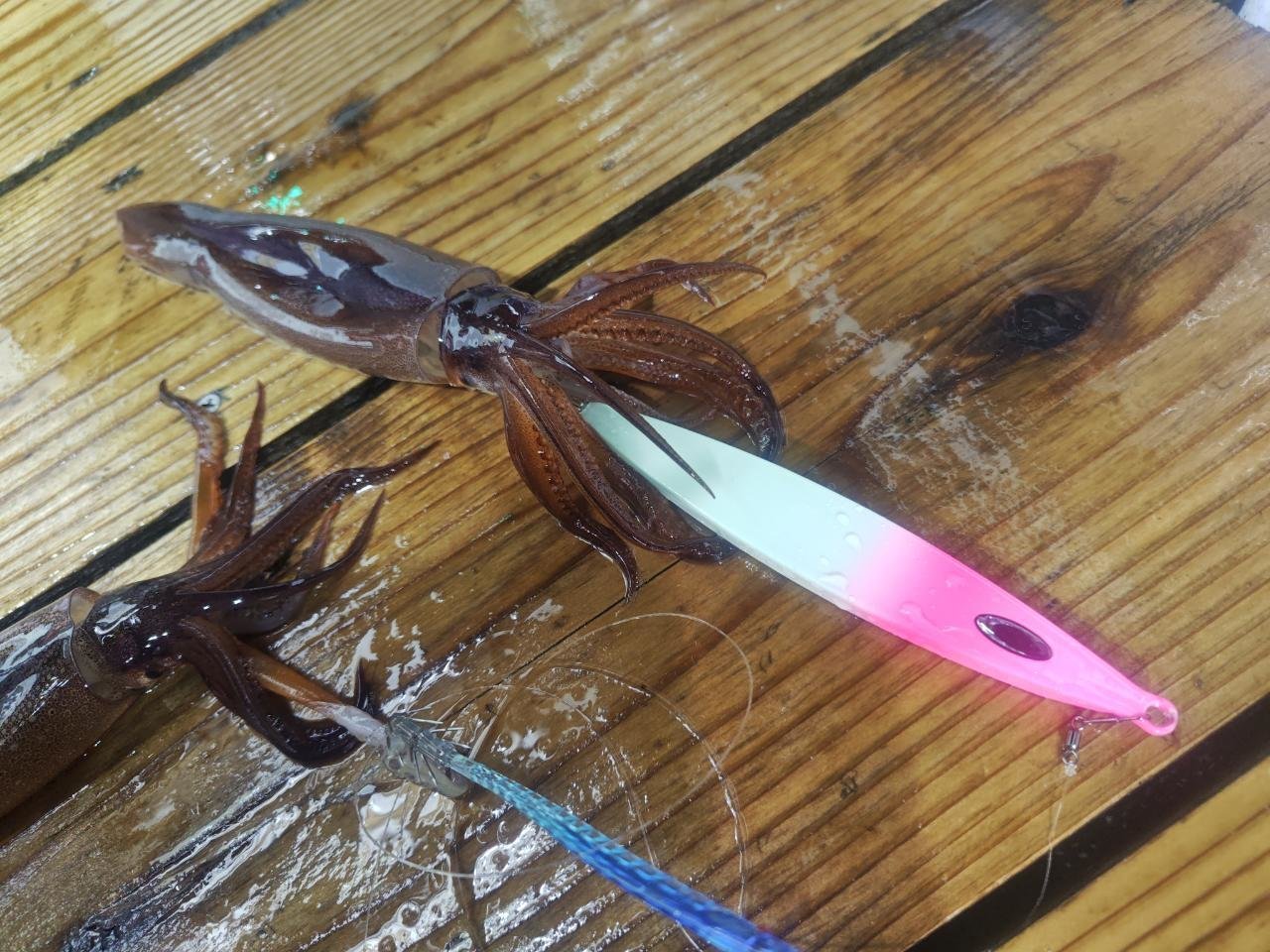しかし、本番は夜焚きが始まってからですよ!30号のメタルに浮きスッテを2本セットしたお馴染み仕掛けで誘っていくとようやくヒット!ボトム付近で1ハイ釣れて一安心。この日の当たりカラーはピンク・ムラサキ・白グローなどがよかったですね^^