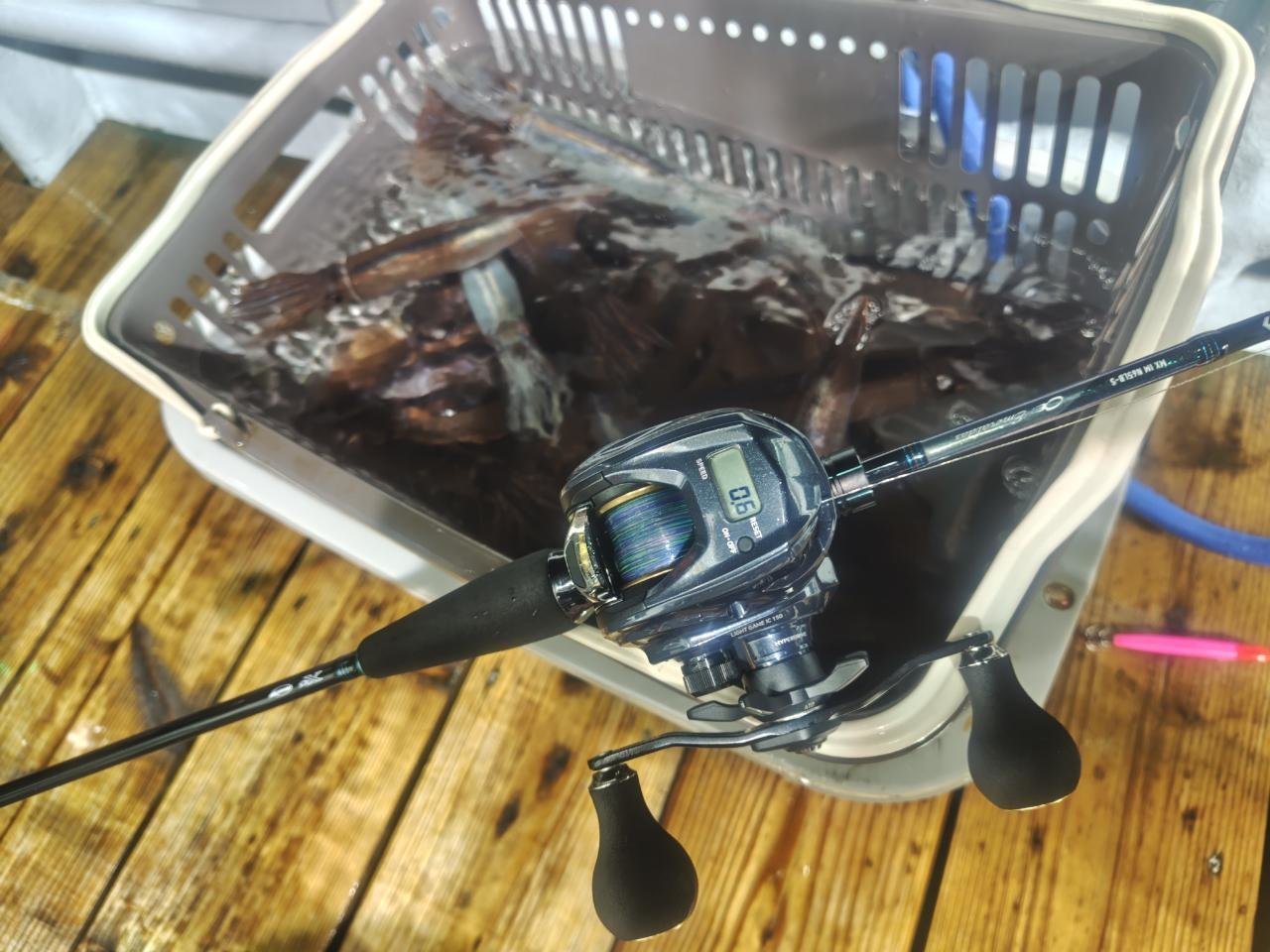 水深40m前後をねらい、オモリ25号でした。途中40号が必要な場面もありましたが終盤には25号でできました。