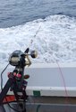 さて釣行開始。普段は20号ほどのスッテからスタートするそうですが、最近は潮が早く30号スタート。船内では明るい時間からポツリポツリとムギイカが釣れています。アタリの棚は60m前後のボトム付近との事ですが、案の定渡辺の竿にアタリはありません(汗。