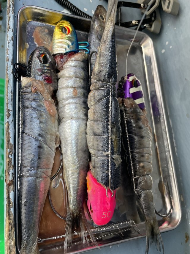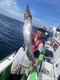 また、同時にチャレンジした餌サワラ釣りでは、天秤にオモリ80号、ワイヤー仕掛けを使用し、エサはマイワシ一匹掛け。