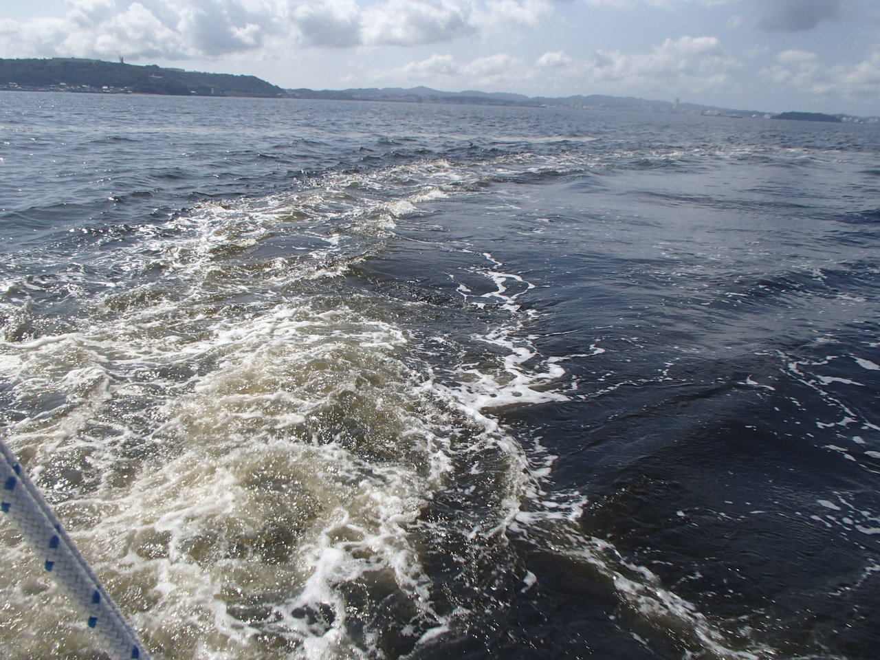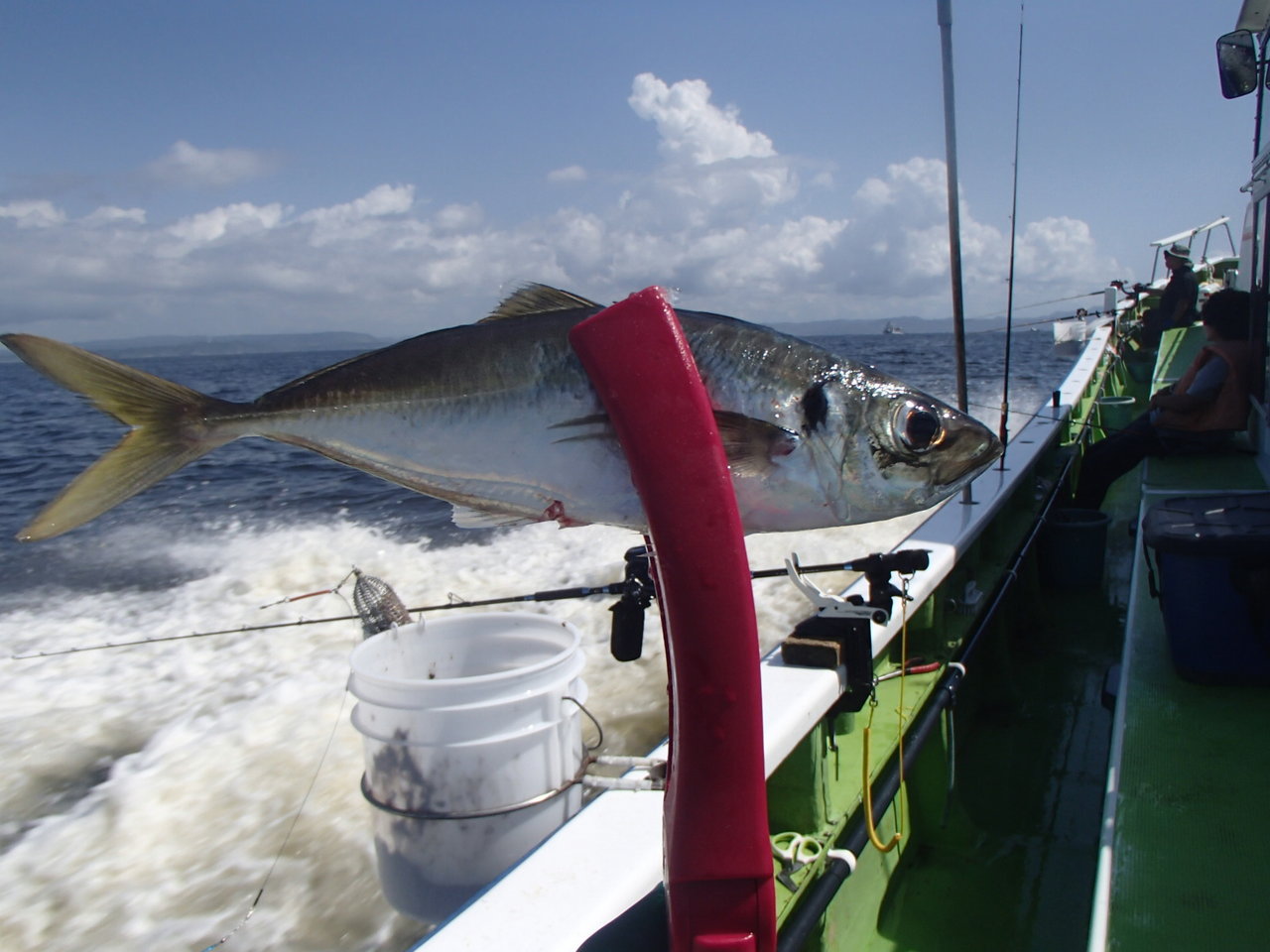 後半戦アジ釣りに移ります。魚の群れが小さくすぐに散ってしまうので数投ごとにポイントを移動します。海堡近くでようやく1匹目上がりましたが20cm程の小型です、水深20mの浅場だから仕方ないと思ってましたが次第にサイズアップし、魚の活性も上がってきました。1時間ほど入れ喰い続きましたが、群れは散ってしまい放浪の旅へ。しかし時間たつごとに潮色が濁りで船上のバケツの底も見えない程です。結局その後いいとこ無しで14時の沖上がり時刻となってしまいました。アジの釣果は15匹中型主体でお土産は確保できました。