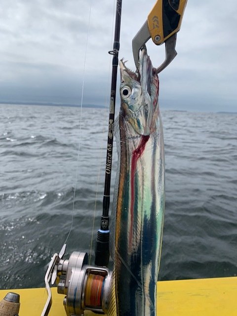 連日の浅場のタチウオが好調という事で、早速、20m前後の浅場からスタートしました。ジグを落としていくと早速、船内でタチウオが上がり始めました。浅場を船で流し続けている限り船内で誰かしらタチウオが掛かる状況となり、活気づいていました。やはり比較的シルエットが小さめのメタルジグが良いようでシルエットの小さなメタルジグにはかなりの確率でタチウオが連れていました。後半は大型狙いで水深60メートル前後を流しました。私には掛かりませんでしたが、船内で大型のタチウオが釣れていました。メタルジグは少し重めの130g前後を使用しました。まだ、依然として狙えそうなので又、大型のタチウオを狙って見たいと思います。