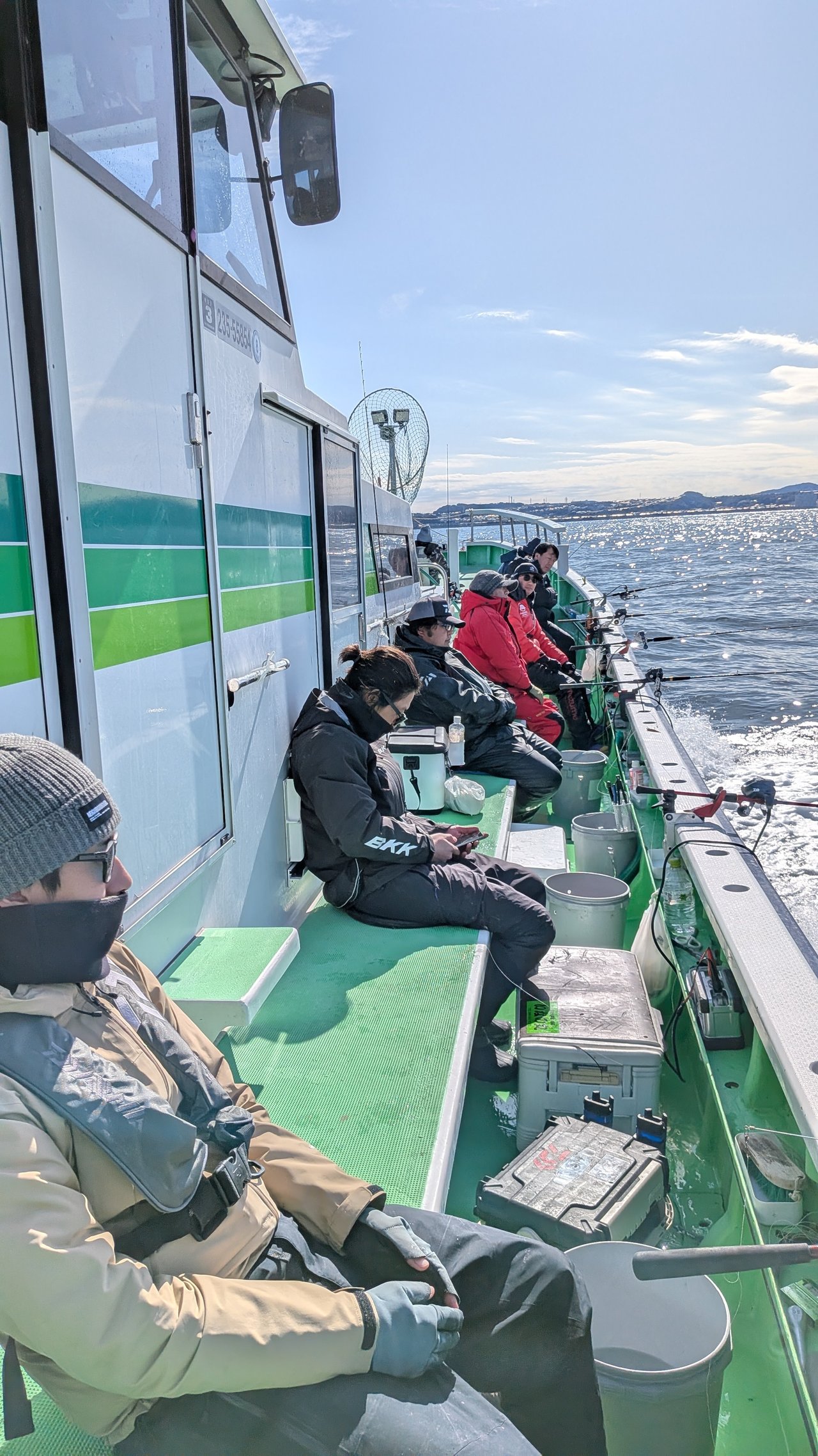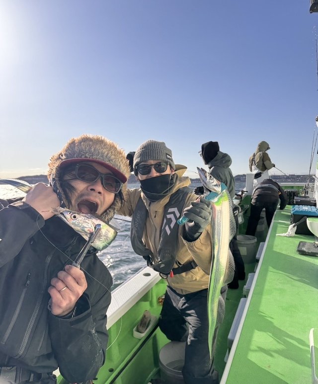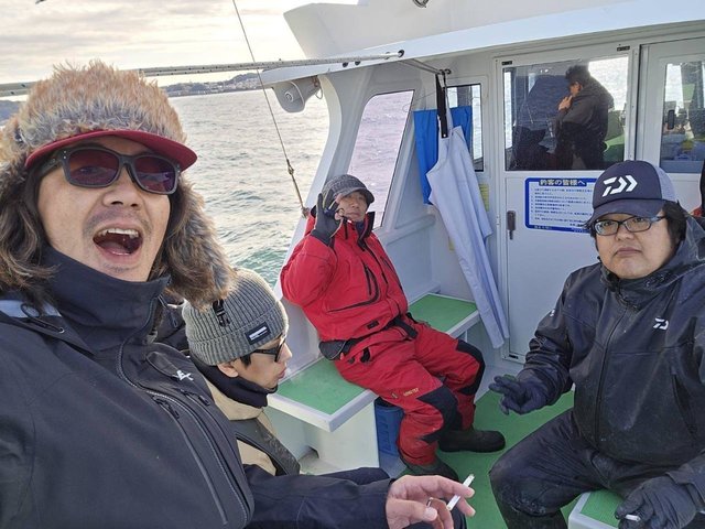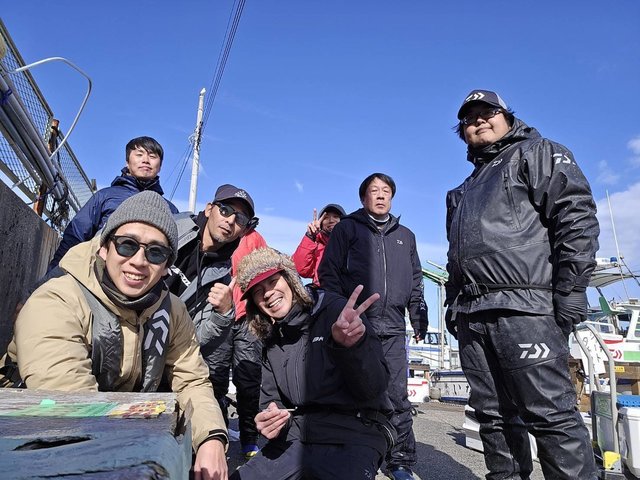 極上タチウオをエサに本部キタニに誘い出され、本部メンバーがのこのこと横須賀大津に集まりました(笑)。氷点下の出船、手がちぎれるかと思いましたが日中は日が出て何とかなりました。私はテンヤほかの7名は天秤チャレンジです。