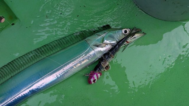 ジグをボトムまで落としてゆっくり巻き始めると2mくらい巻き上げた位置で数回ココンッとアタリが、バンドル3回まわしてアタリなければ落とすを繰り返し遂にゴゴン!と重たいアタリがテンション抜かずに巻き上げて2本のタチウオを釣る事が出来ました(^^)