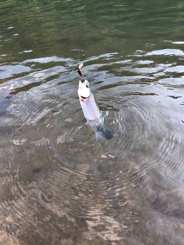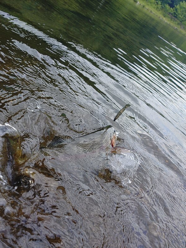 2日前の予報で台風の端っこの雲が通って雨が降ればと思いましたが東にそれ晴天に。この日は真夏らしく水も澄んで少なく釣果も少ない厳しい状況です。その分人も少ないためプレッシャーがかかって無さそうなゆる~い流れのポイントで静かにじっくりやれました。サスペンドに調整したルアーを動かさずにゆっくり引き時々止めて漂わせてるときのアタリが多く、糸が緩んでるので掛からなかったり、すぐジャンプして外れたり、ルアーが飲まれたり等バレやすいですが、丸見えバイトも見れて楽しめました。