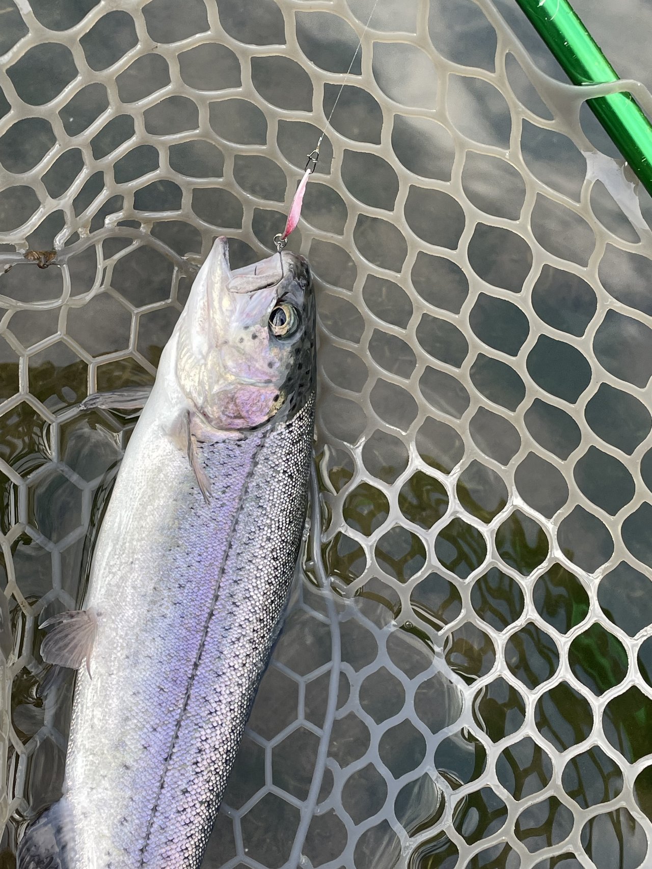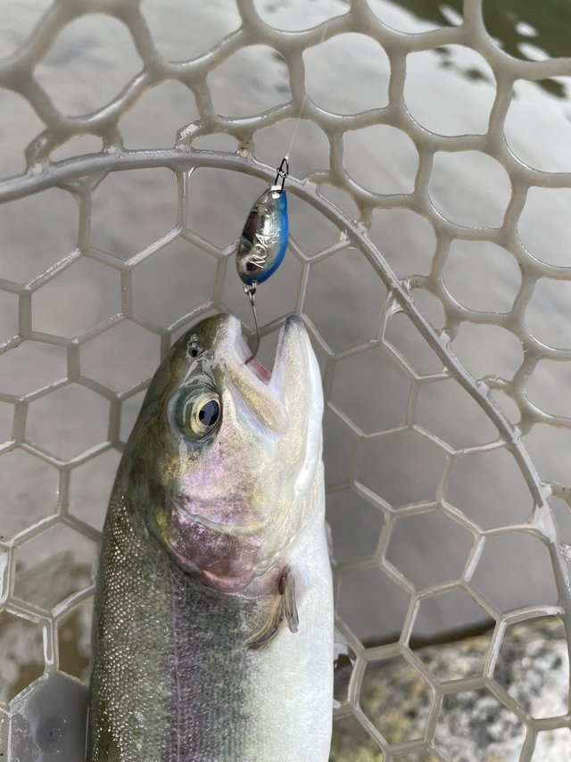 東久留米店吉田です!祝鮎解禁!ですがまだまだエリアトラウトが忙しいので自分の解禁はお預けです。1カ月ぶりのホーム鹿留へ。前日までの雨の濁りが少しあるようです。朝の水温は13℃。涼しいですが曇り気味もあって魚はほぼ表層。高活性向けのスプーンでのサーチは好反応!ナイロン、フロロ、エステルとタックルをローテーションしド表層から一段下の30~50センチを探りいいアタリが出るタナを探します。最初の1時間で20匹ペース。まだまだイケますがボトムもやってみるとこちらもポツポツ釣れます。表層の魚が追っていくようです。プラグも上から1m以内を意識すれば連発!スローに見せていく釣りです。トップはいくらでも。ルアーサイズと飛距離、ラトルの有無を使い分けローテーション。午後は好調なカラーが午前とはガラッと変わり翻弄されますが、それをアジャストしていくのもまた楽しみのうち。ラスト1時間はどうにもならないくらい枯れてしまい、釣り座を移動。それが正解で30匹程追加しあとちょっとで3ケタのところで帰宅時間となりタイムアップ!筋肉痛になるくらいたくさん釣れて楽しめました!