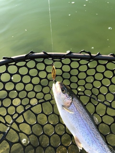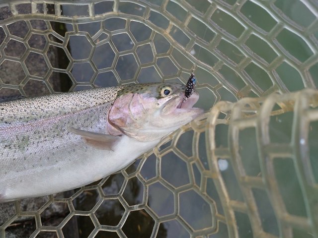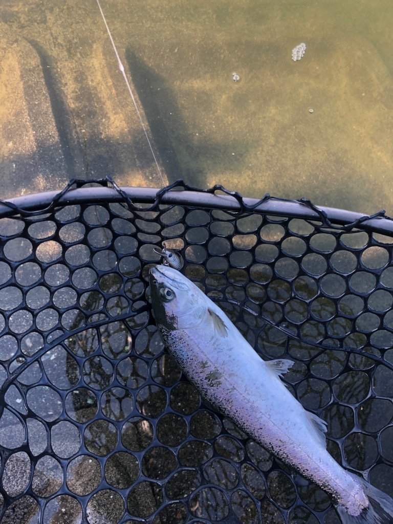 ルアー池は今日は私にも優しかったです。マイクロスプーンを目線を上で巻いて釣れたり、浮上系ミノーで連発タイムもあったり、足元に中型のサクラマス?が縄張りを張っていたのでダートマジックで釣ったりと、クローズまで楽しめました。