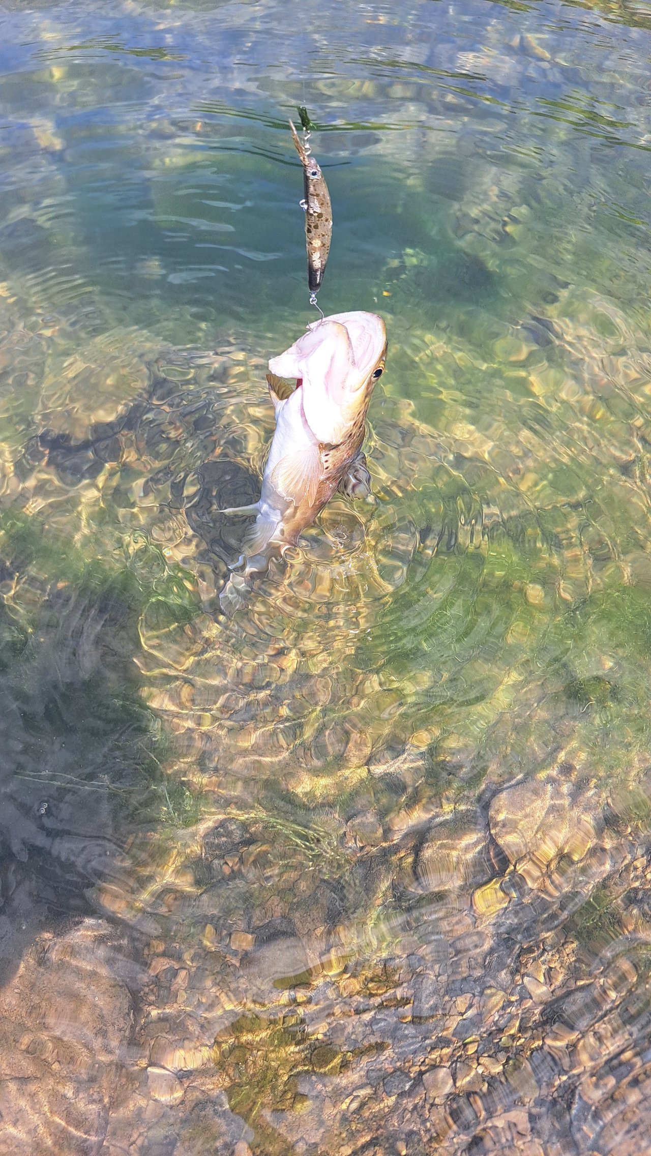 先ず1投目は、トップを投げました!すると着水して直ぐにバイトがあり、1匹目が釣れました!