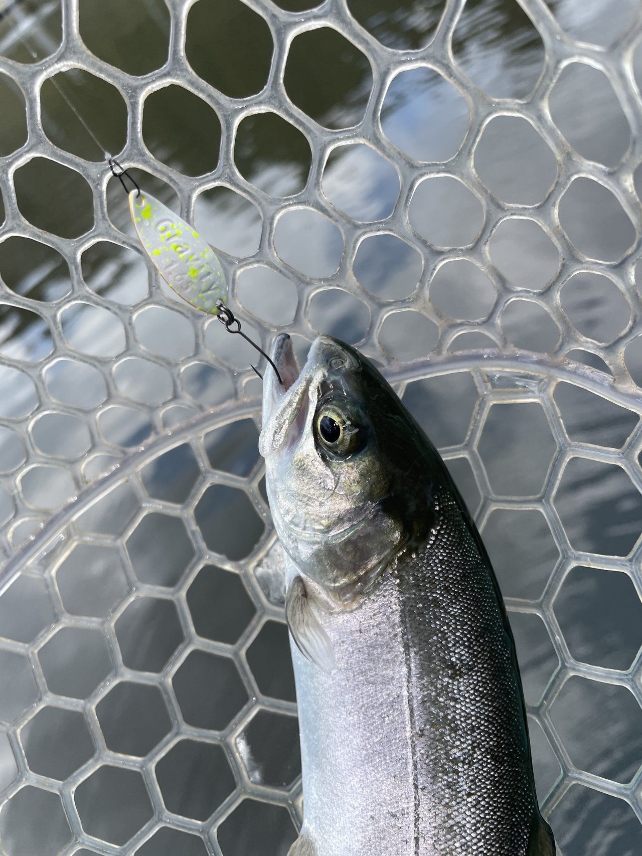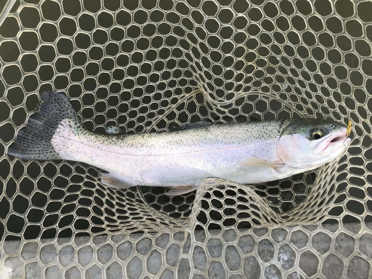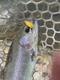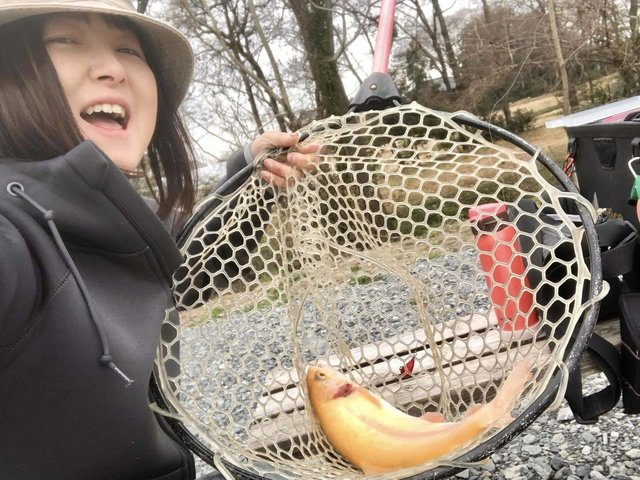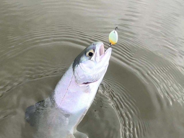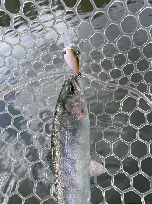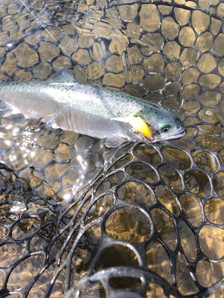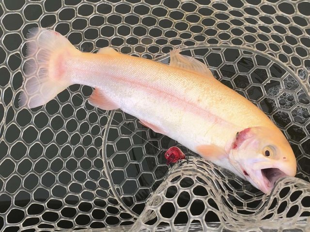ショートバイトからのカラーチェンジでいいバイトが出てしっかりフッキングしアルビノニジマスに会えました♪