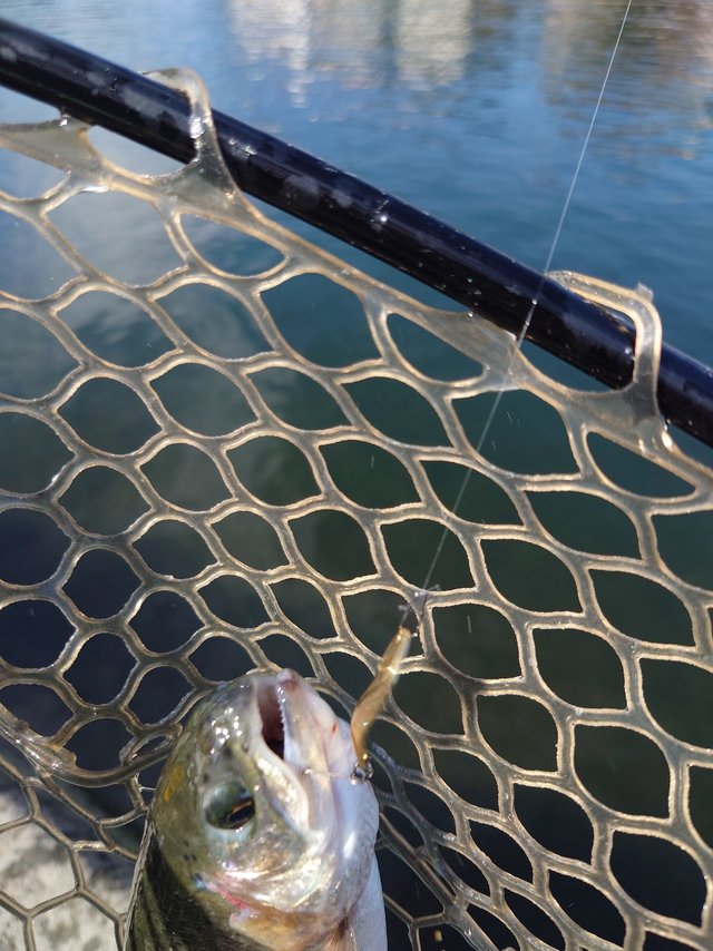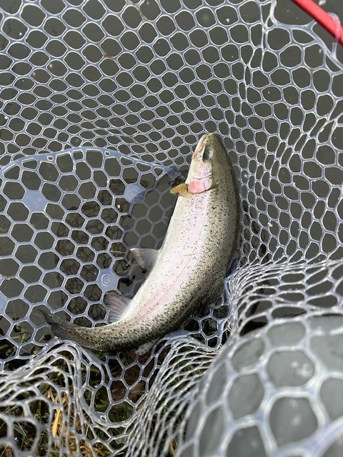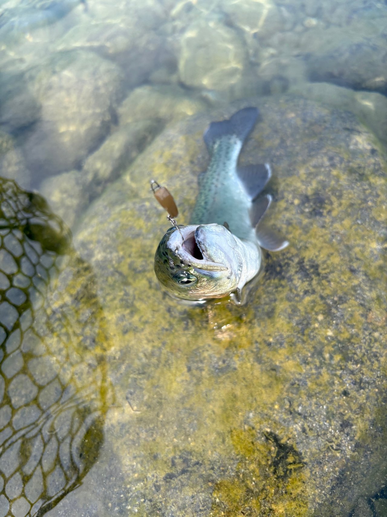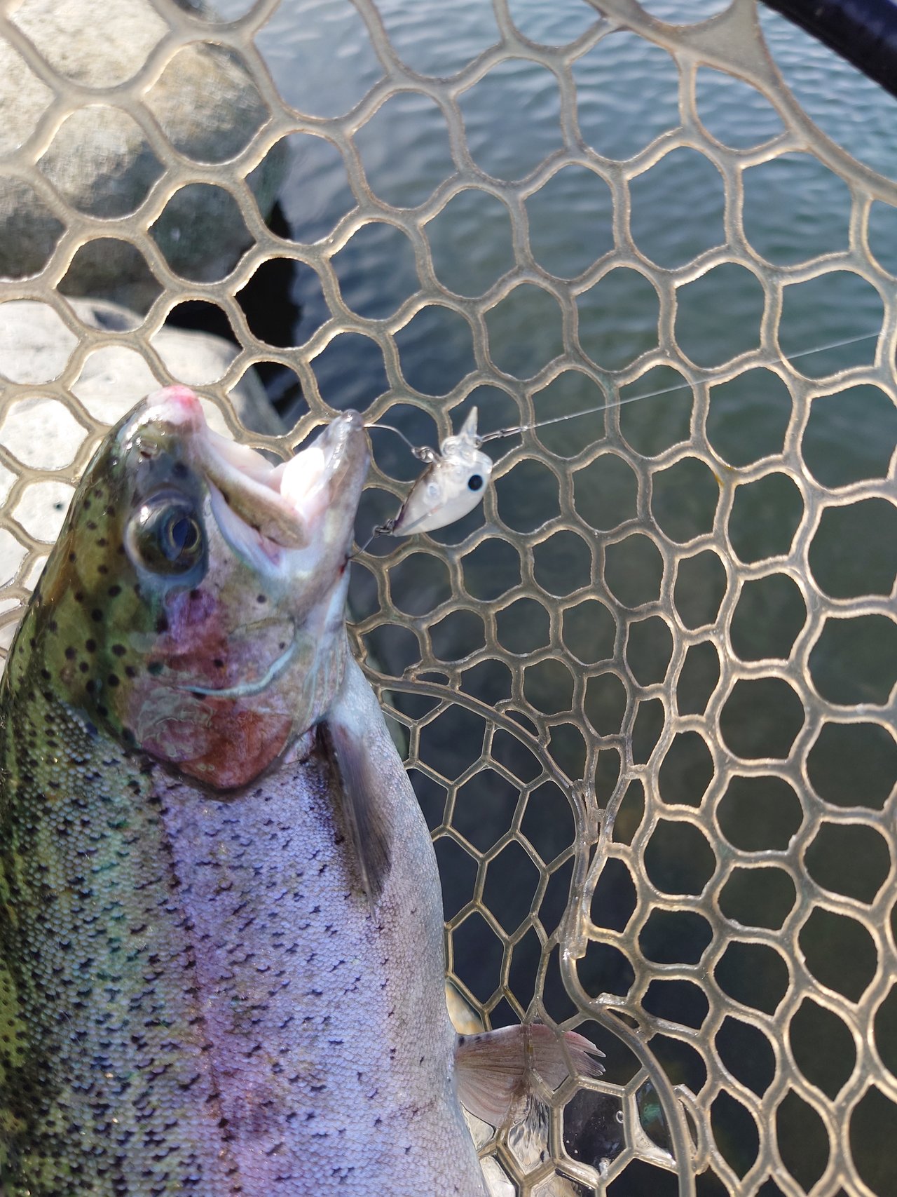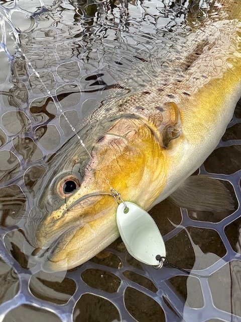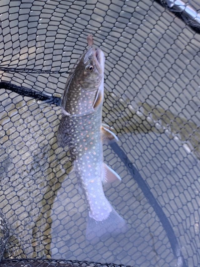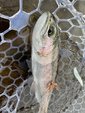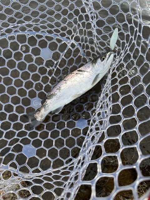 ショートバイトからのカラーチェンジでいいバイトが出てしっかりフッキングしアルビノニジマスに会えました♪