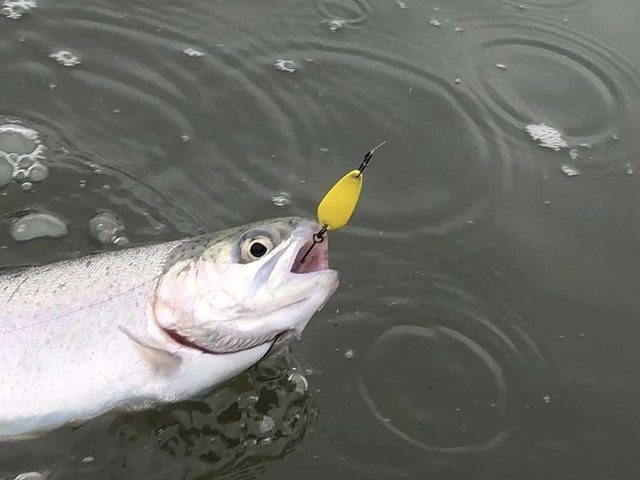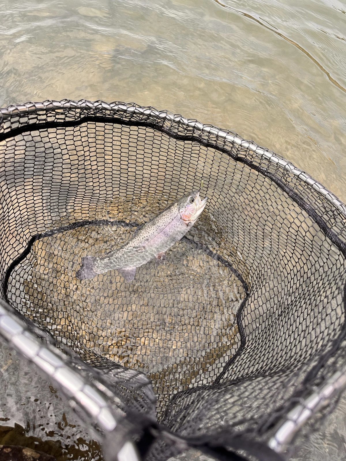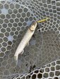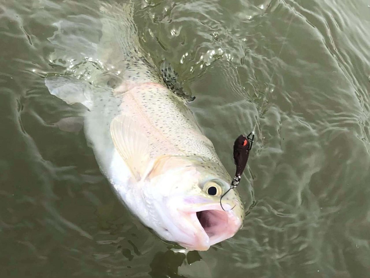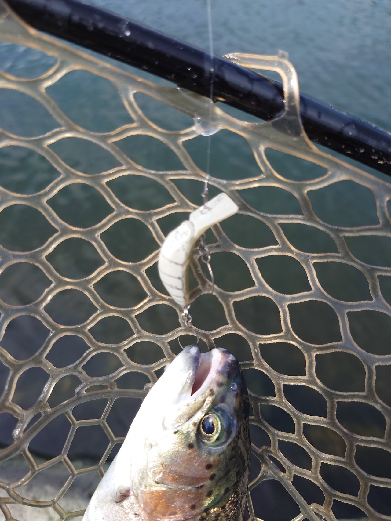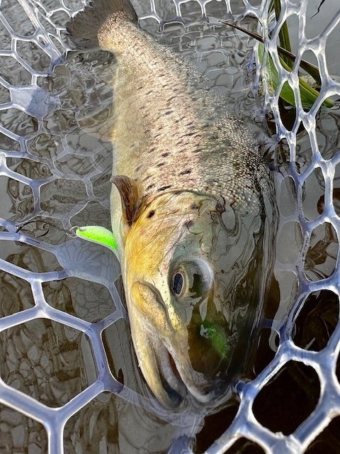 ショートバイトからのカラーチェンジでいいバイトが出てしっかりフッキングしアルビノニジマスに会えました♪