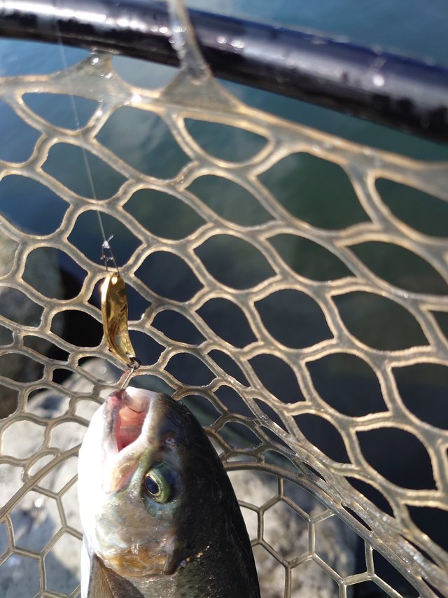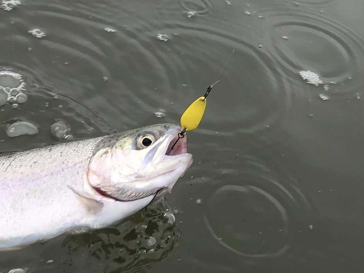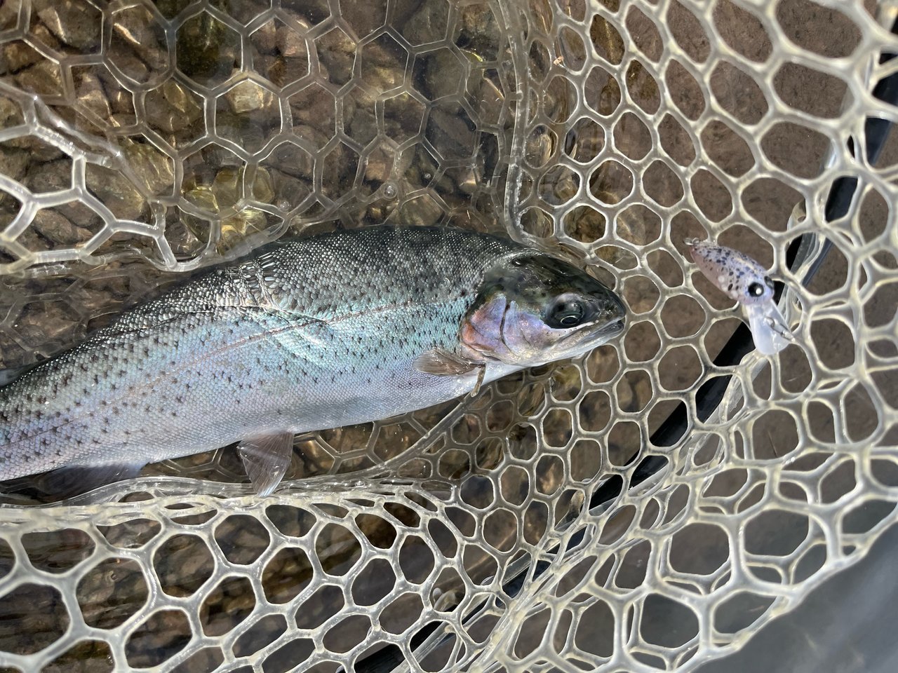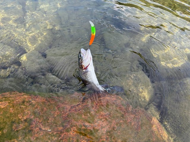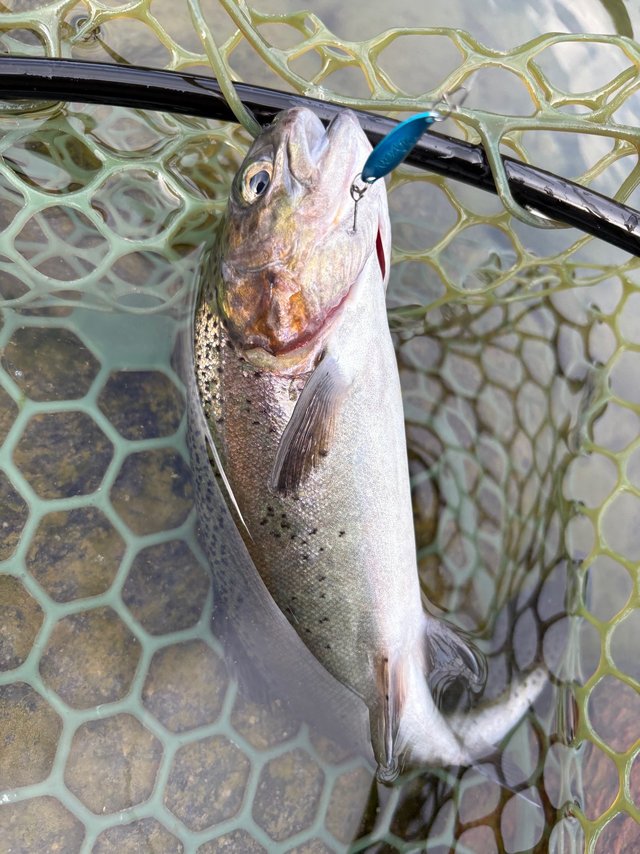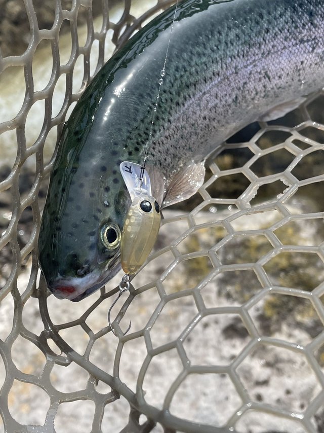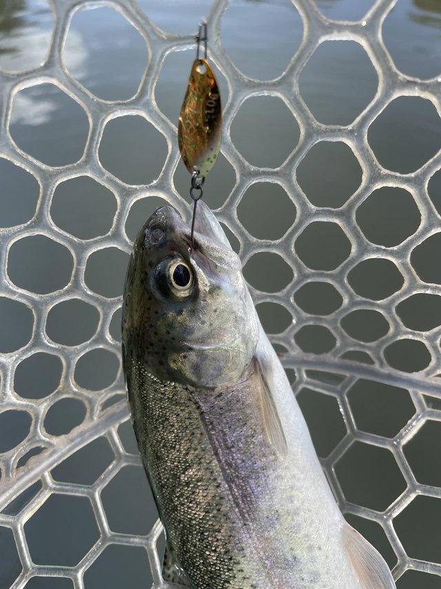 一匹目はスプーンでとノアの1.5gから始めたものの釣れず…早々に諦めていつもお世話になっているチャタクラを投入!するとすぐに反応があり元気なニジマスを釣ることが出来ました。ハンドル2回転分程沈めてゆっくり巻いてくるとドンとアタリがある感じです。