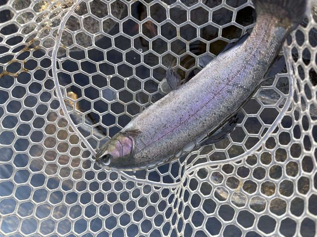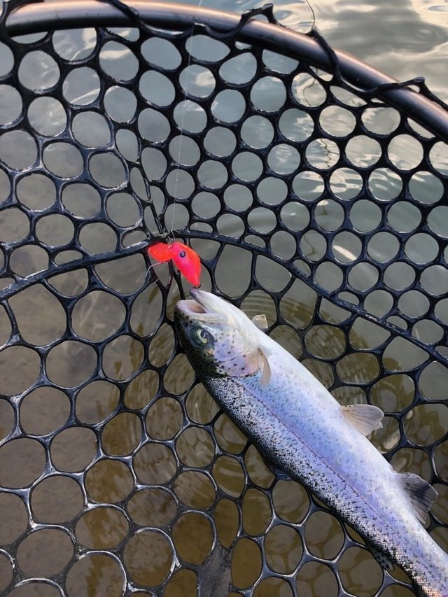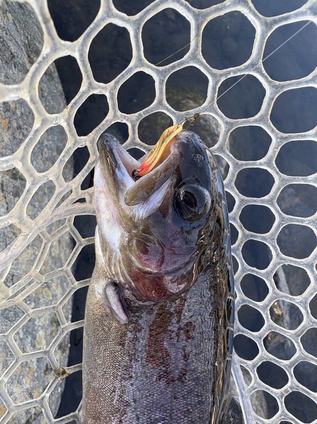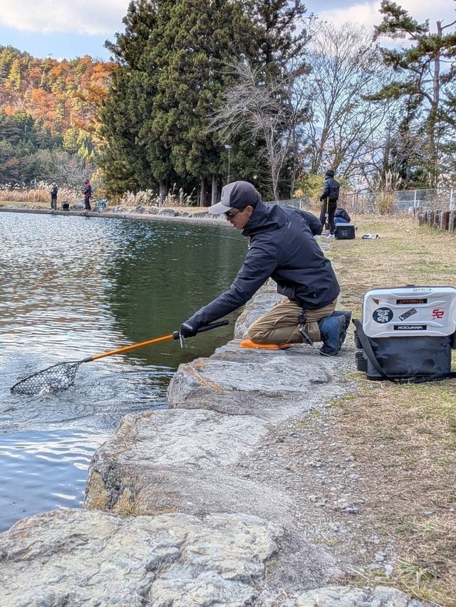 東久留米店吉田です。来月の試合に向けて練習ですが3連休の渋滞を考えいつもの鹿留へ。朝は気温1℃。風が強く体感温度はかなり低いです。水温は6℃。近くの河口湖がまだ15℃あるそうで、比べるとかなり落ちてきているのが分かります。開始スプーンへの反応はほぼ無し。ボトムと最近放流されているサクラマス狙いのミノーでポツポツ。日が差してきて風も止み魚が中層に浮いてきたらクランクへ。10時頃午前の放流が入り、いきなりボトムベタベタで連発モードお客様と20本ずつ程。遠投必須なので重めだけどゆっくり引けるドーナが良かったです。午後放流は一転中層から上で速めの魚。それほど続かず10本程。ポンドが日陰になりその後も終了まで高活性。ミノーやボトムも好調。メーカー縛りで良い練習が出来ました。周りを見ていると放流で魚がたくさん入っているにも関わらず釣れているお客さんが少ない印象。自分の場合は高感度なPEタックルで重めの放流スプーンを遠投し色々な層をチェック。放流魚が回遊してきて反応があり、馴染んで活性が上がってきたらフロロタックルに持ち替えて良いアタリをしっかり乗せられる様にしています。今回はフロロラインのたるみを弾くように誘いを入れるのが有効でした。サクラマスは全体釣果の1割程でした。