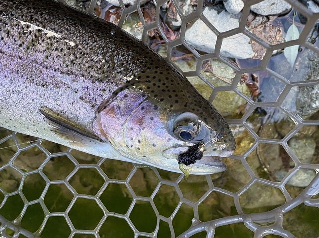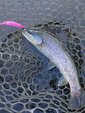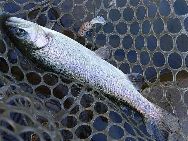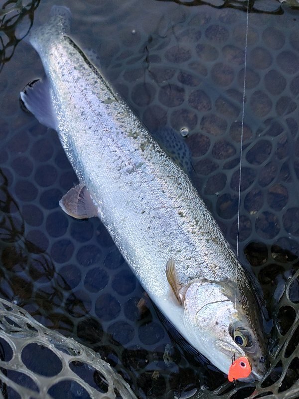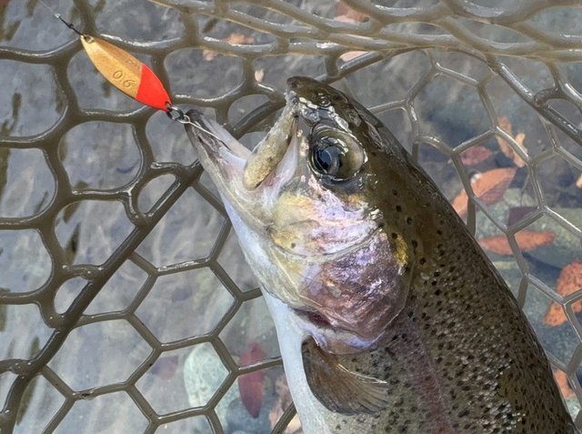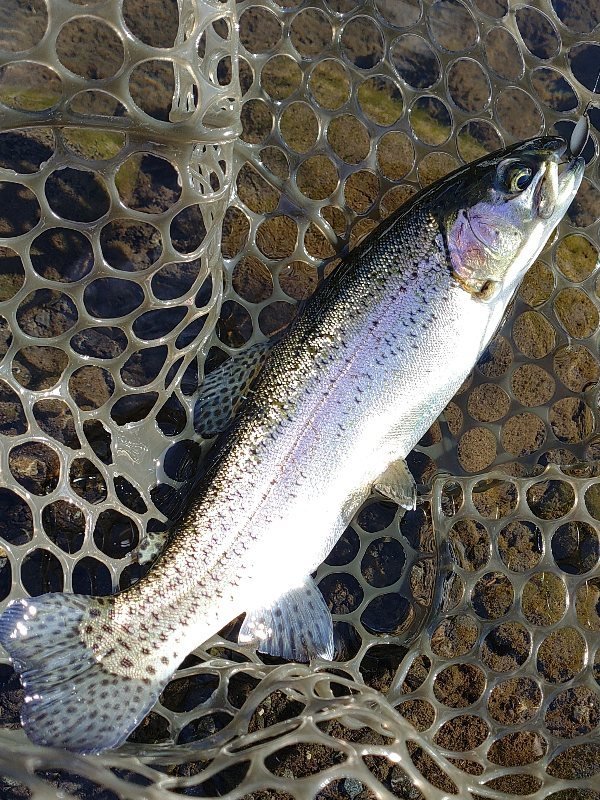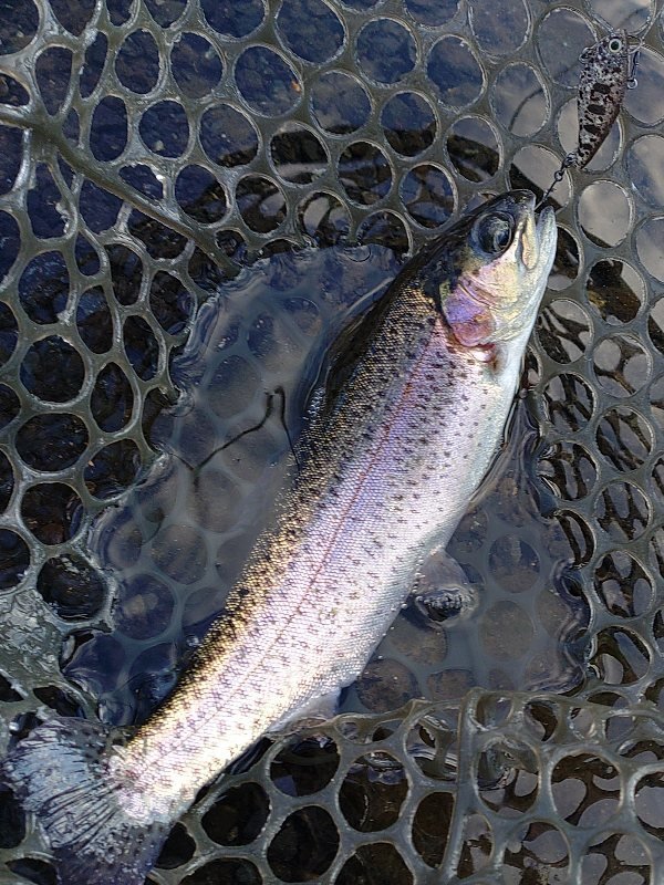 ドーム船でワカサギの予定でしたが、強風のため欠航…という事で急遽リヴァスポット早戸さんに行ってきました!7時ごろのに到着しましたが既に多くのお客様で賑わっていました。一度場所を決めたら動けなさそうなのでお昼まで1区画でみっちり。前回同様0.6g~1.1gのレンガ系とカラシ系の色がハマり連発!少し反応悪くなったかな~のところで同じカラーでウェイトを下げてまたまた連発。一緒にいった二人があの手この手使うも釣れず首をかしげてこちらを見ていました(^v^)にしし…。トラウト初挑戦の上司にヒットカラーを渡し、巻き速度を教えると初キャッチ♪優し目アピールのマイクロクランクも好反応でした。後半は少しだけフライも。マラブーを流れに乗せてポツポツとキャッチ。