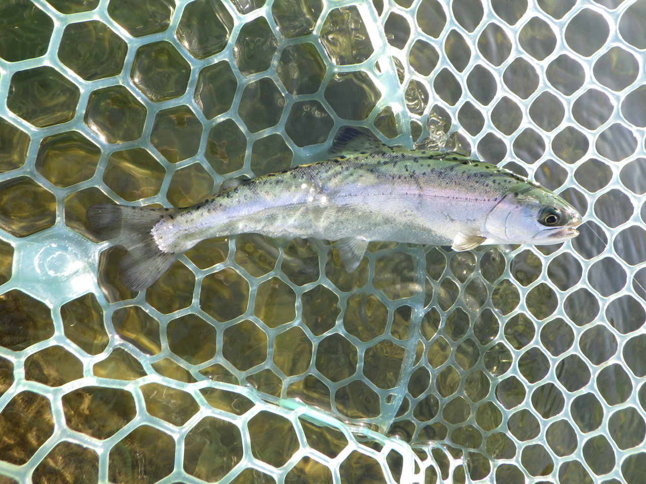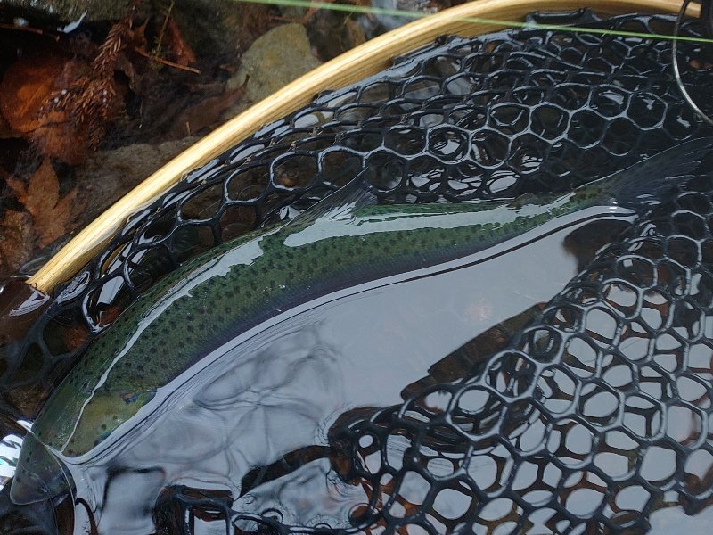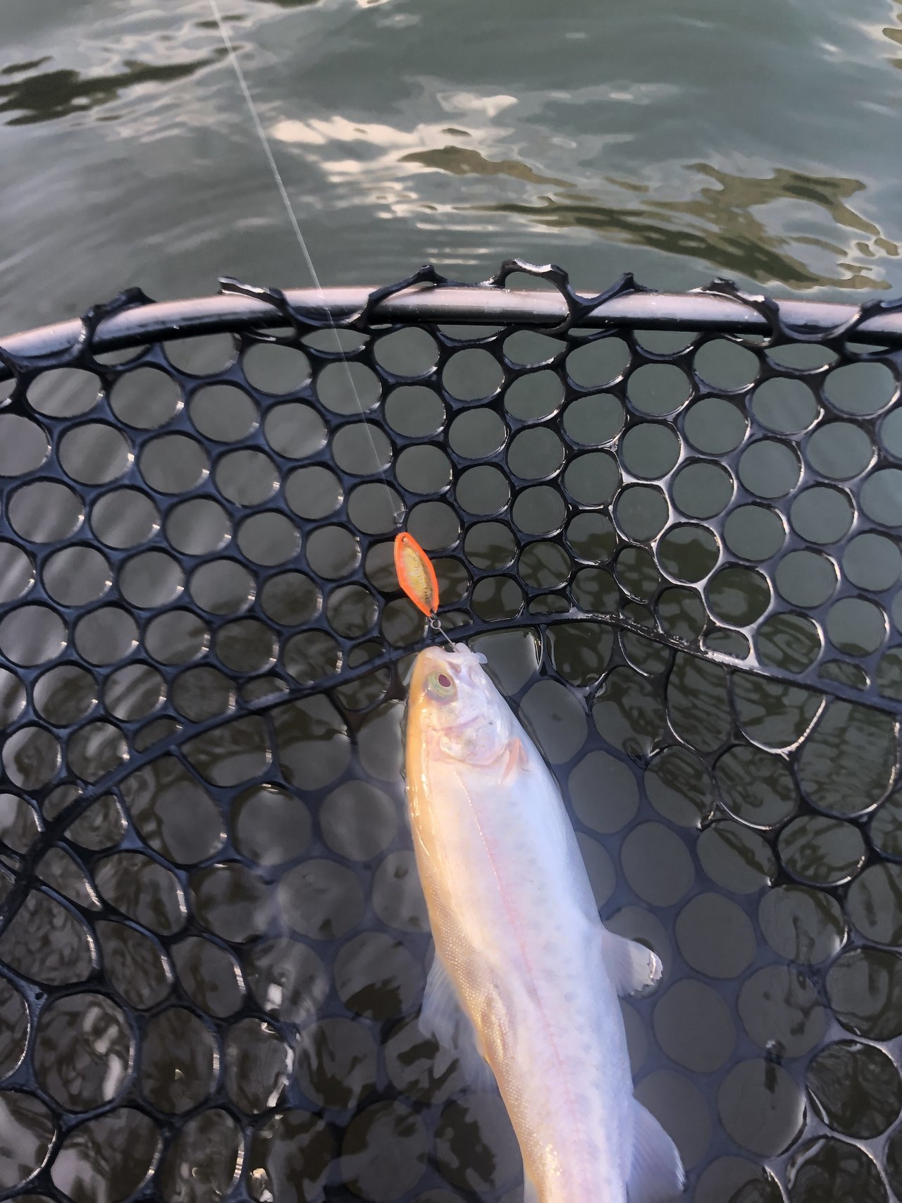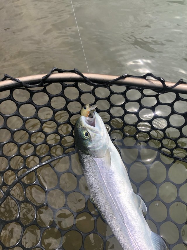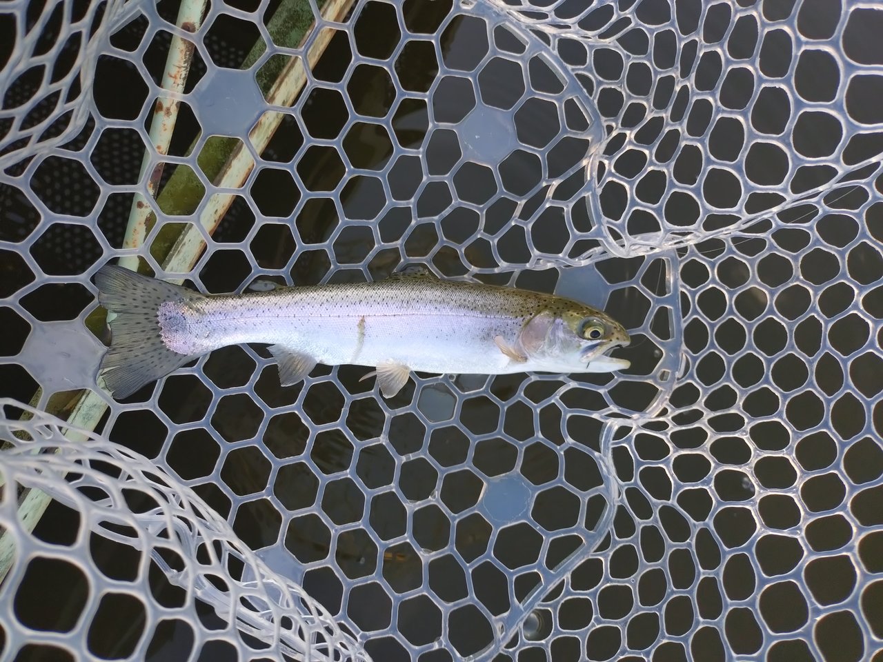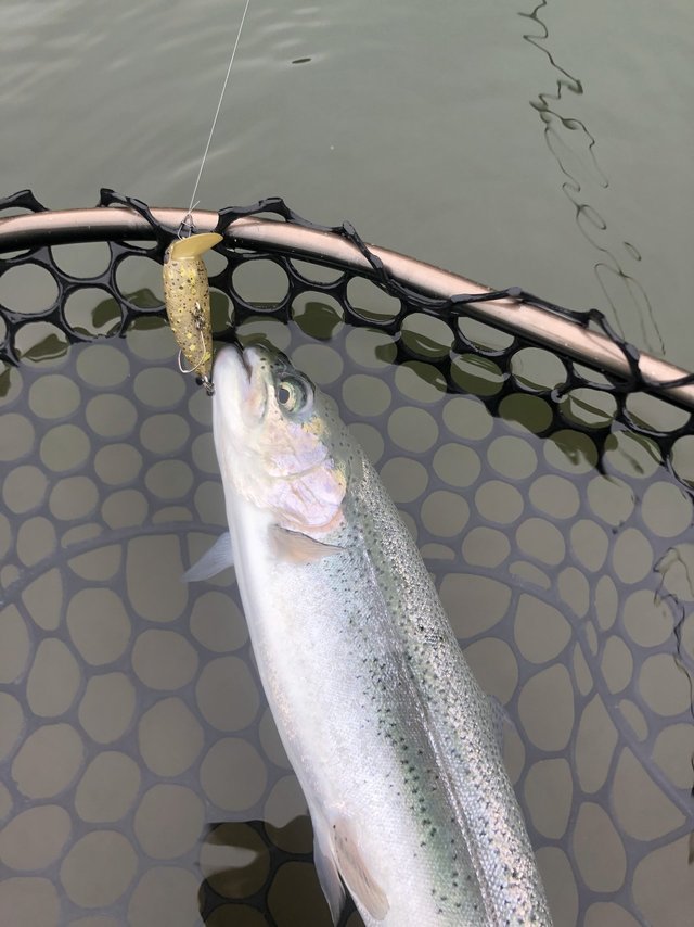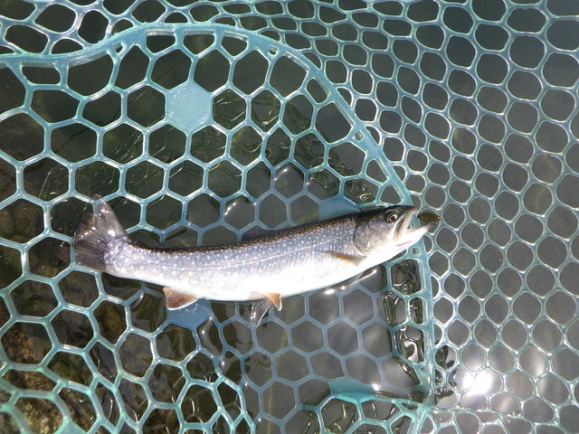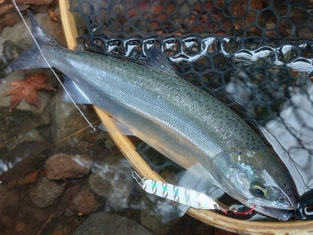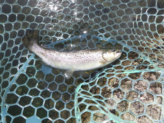 まずは釣れて一安心(笑)顔つきがニジマスと違うので最初はヒメマスかと思いましたが、背側に黒斑があるので多分コーホーサーモンだと思います。間違ってたらスミマセン(笑)