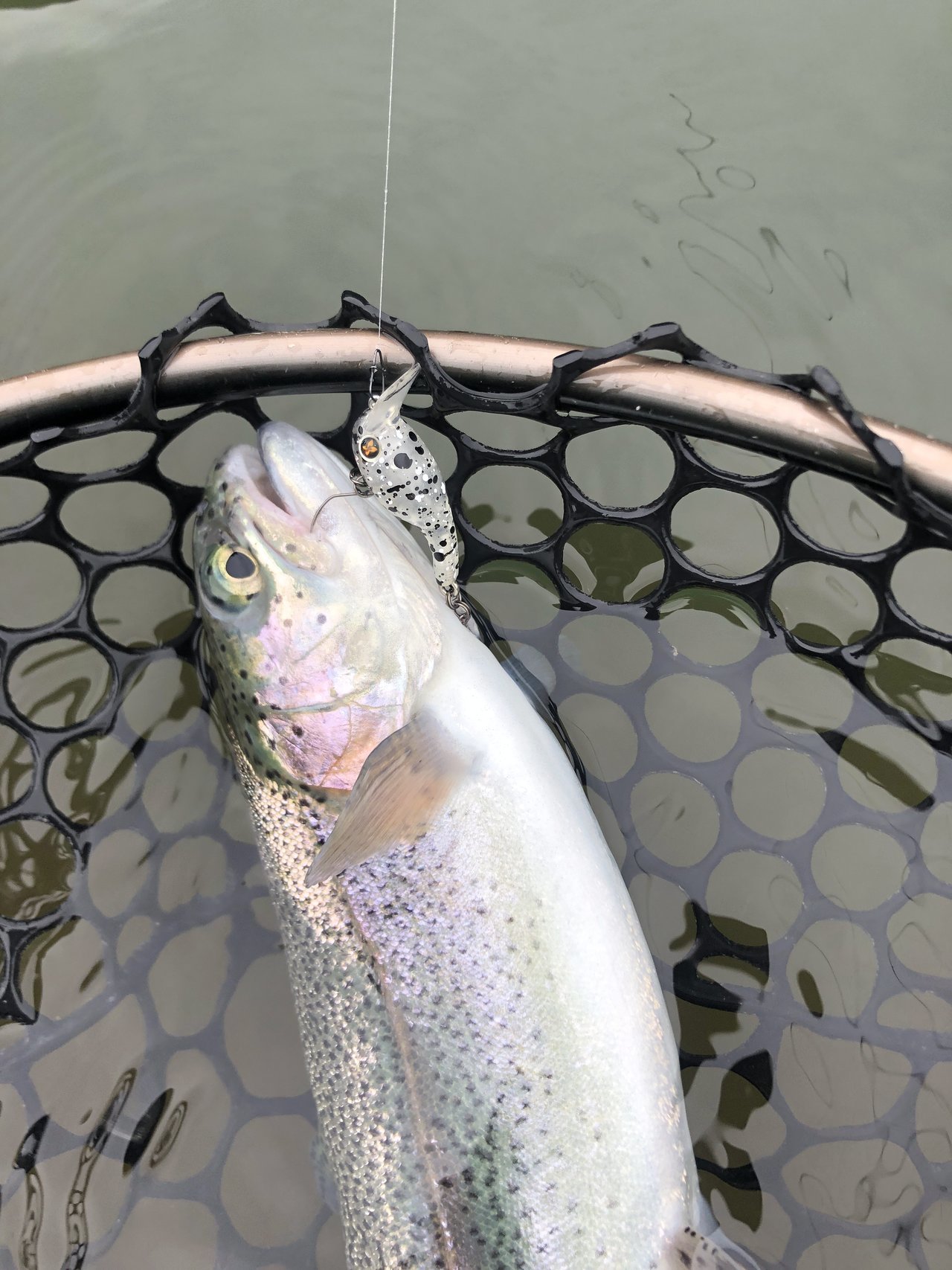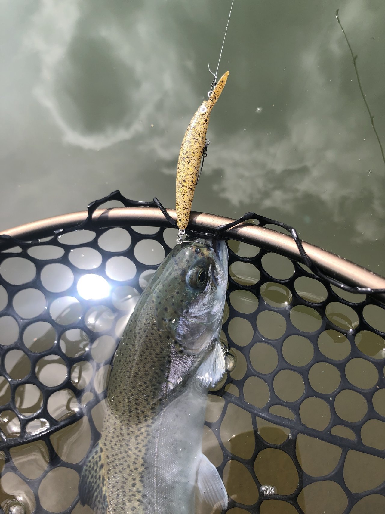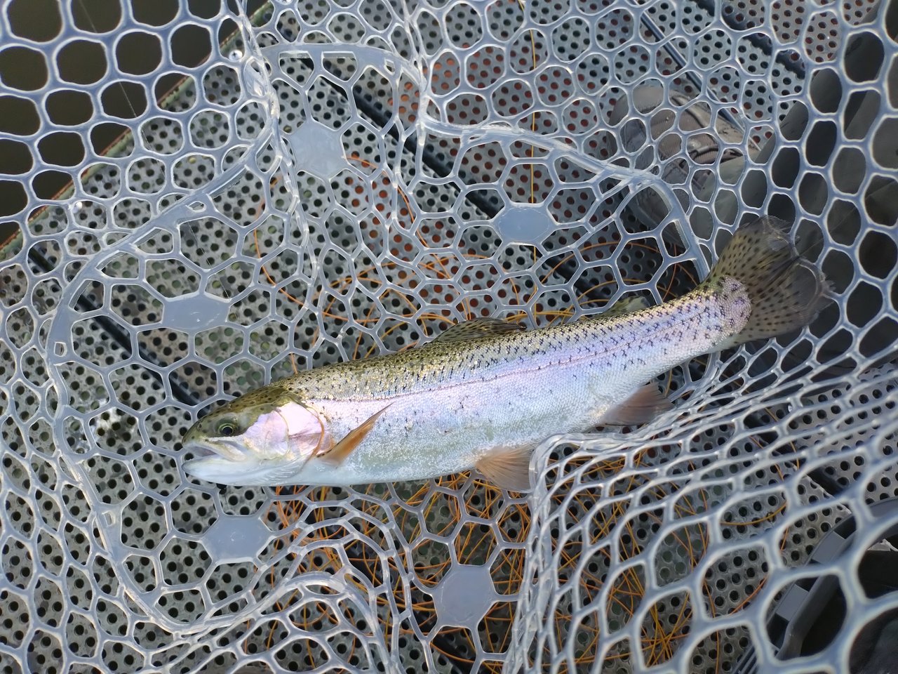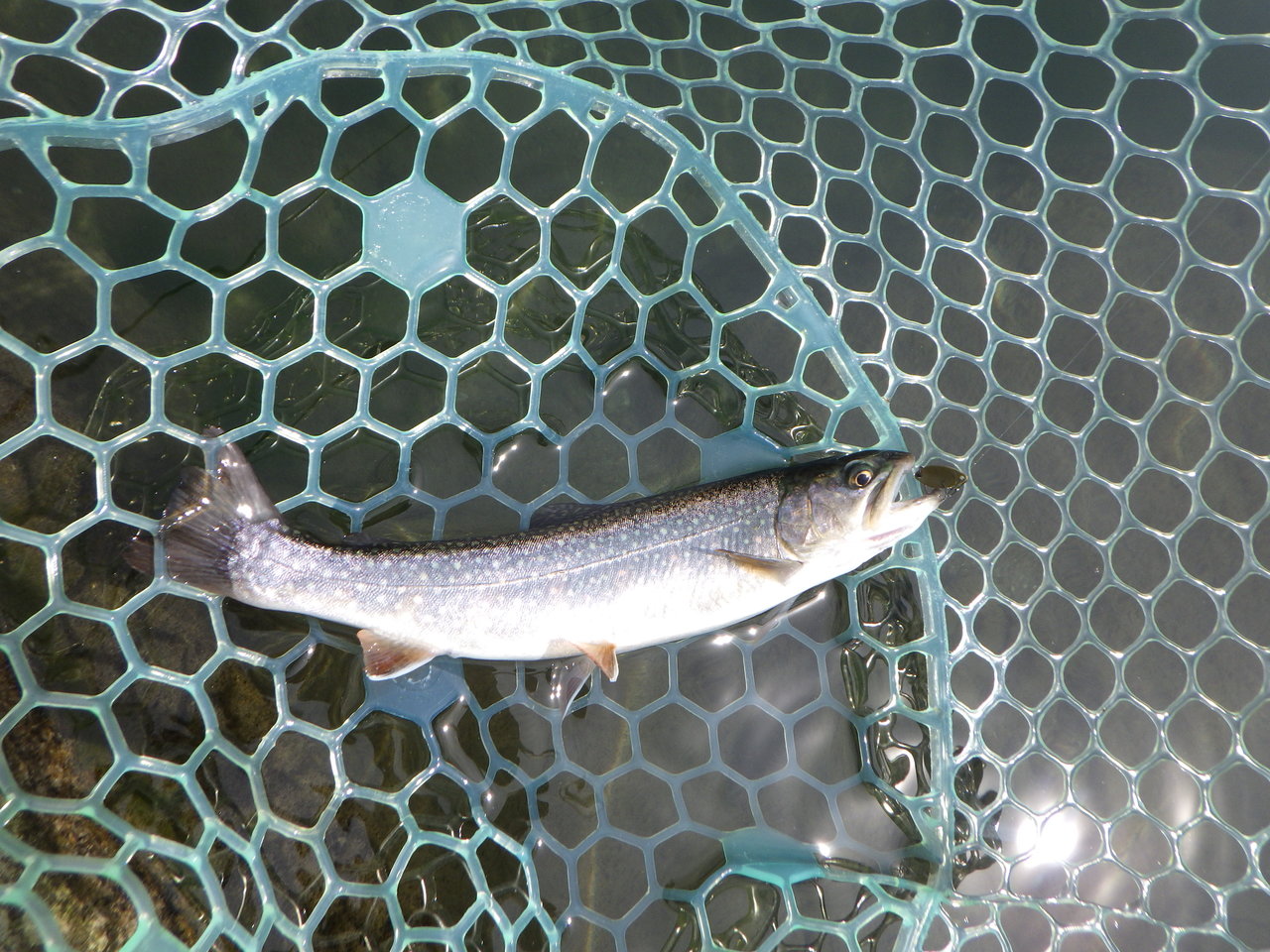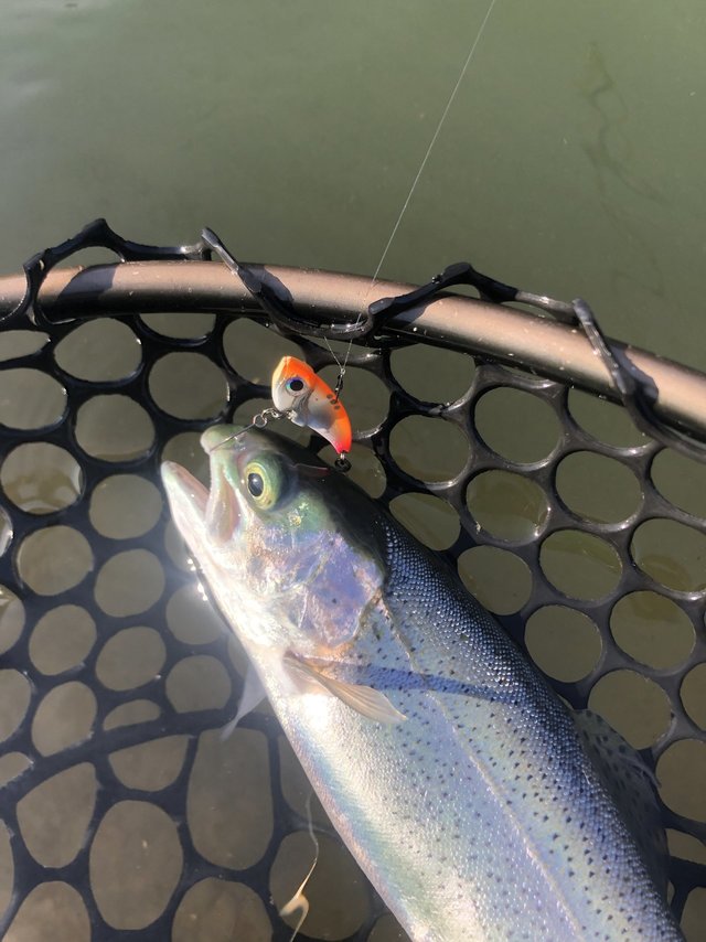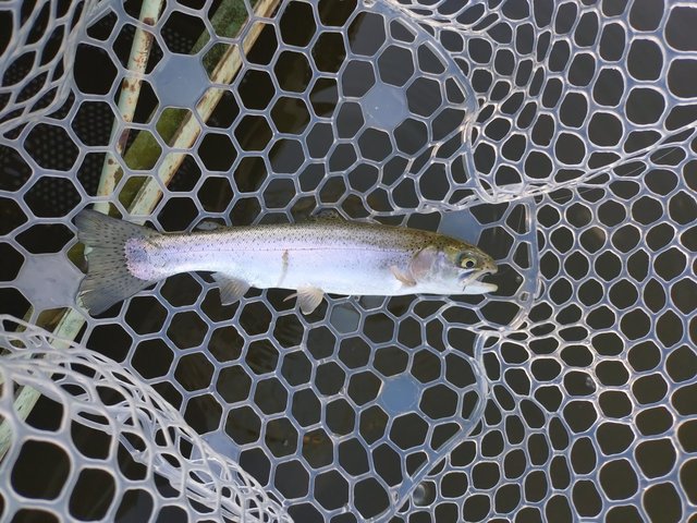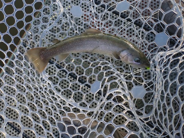 風が弱まった時にキャストし、リトリーブしてポツポツとニジマスをキャッチしました。